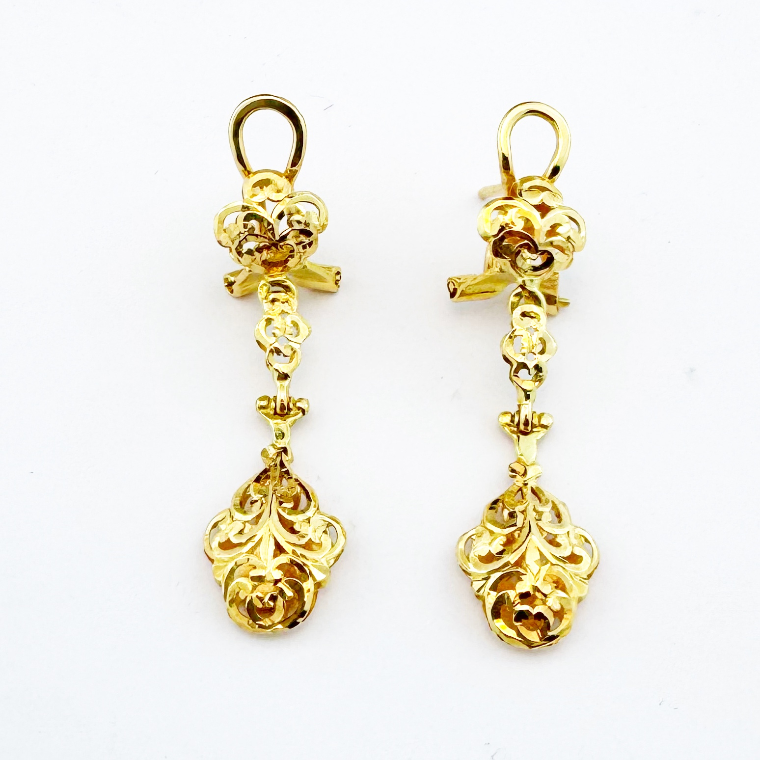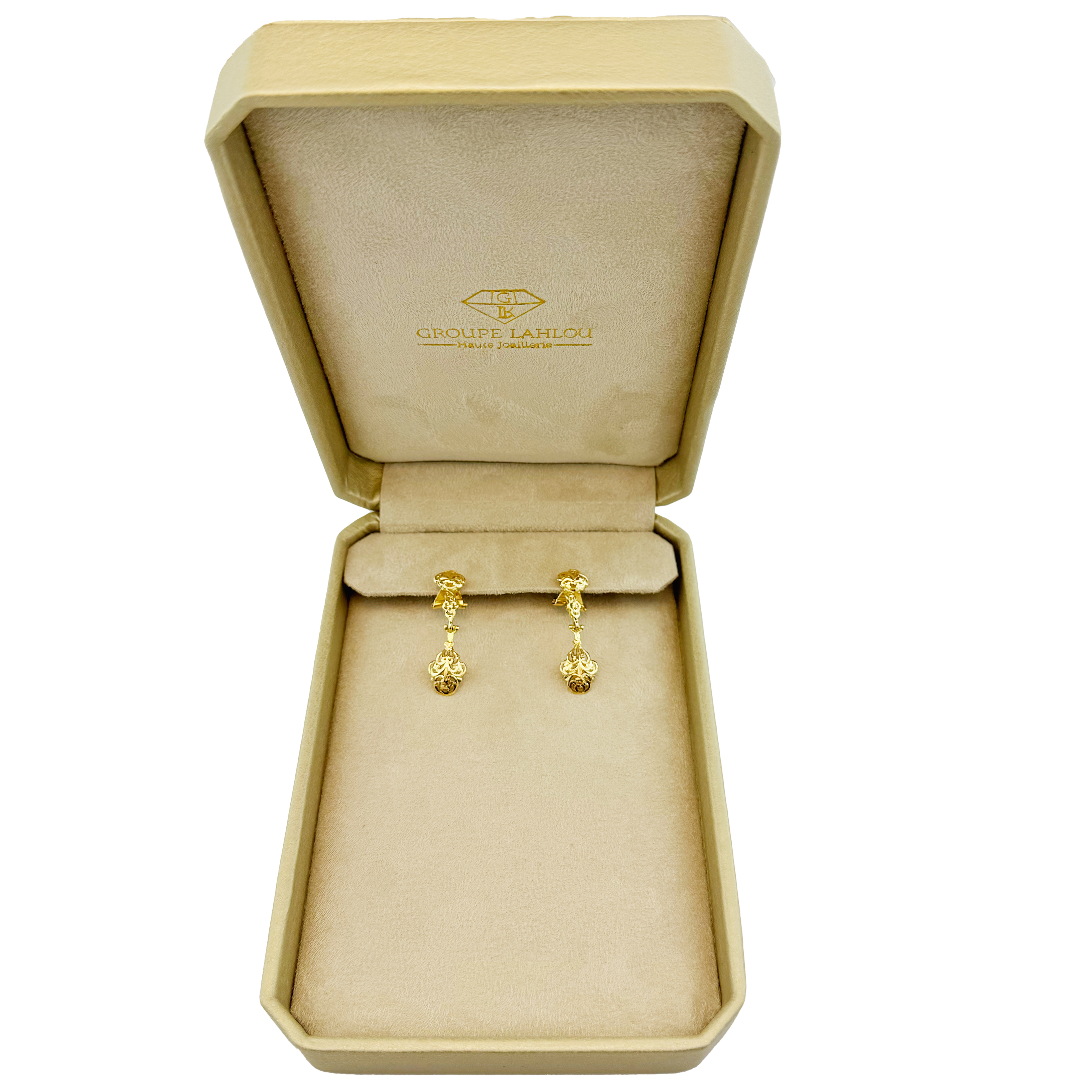 Plongez dans l’âme du raffinement ancestral avec ces boucles d’oreilles pendantes en or jaune 18 carats, finement sculptées dans un esprit baroque oriental. Chaque détail minutieusement travaillé évoque les arabesques des palais andalous et les motifs floraux chers à l'artisanat marocain, faisant de ces bijoux une ode au patrimoine et à la féminité intemporelle.