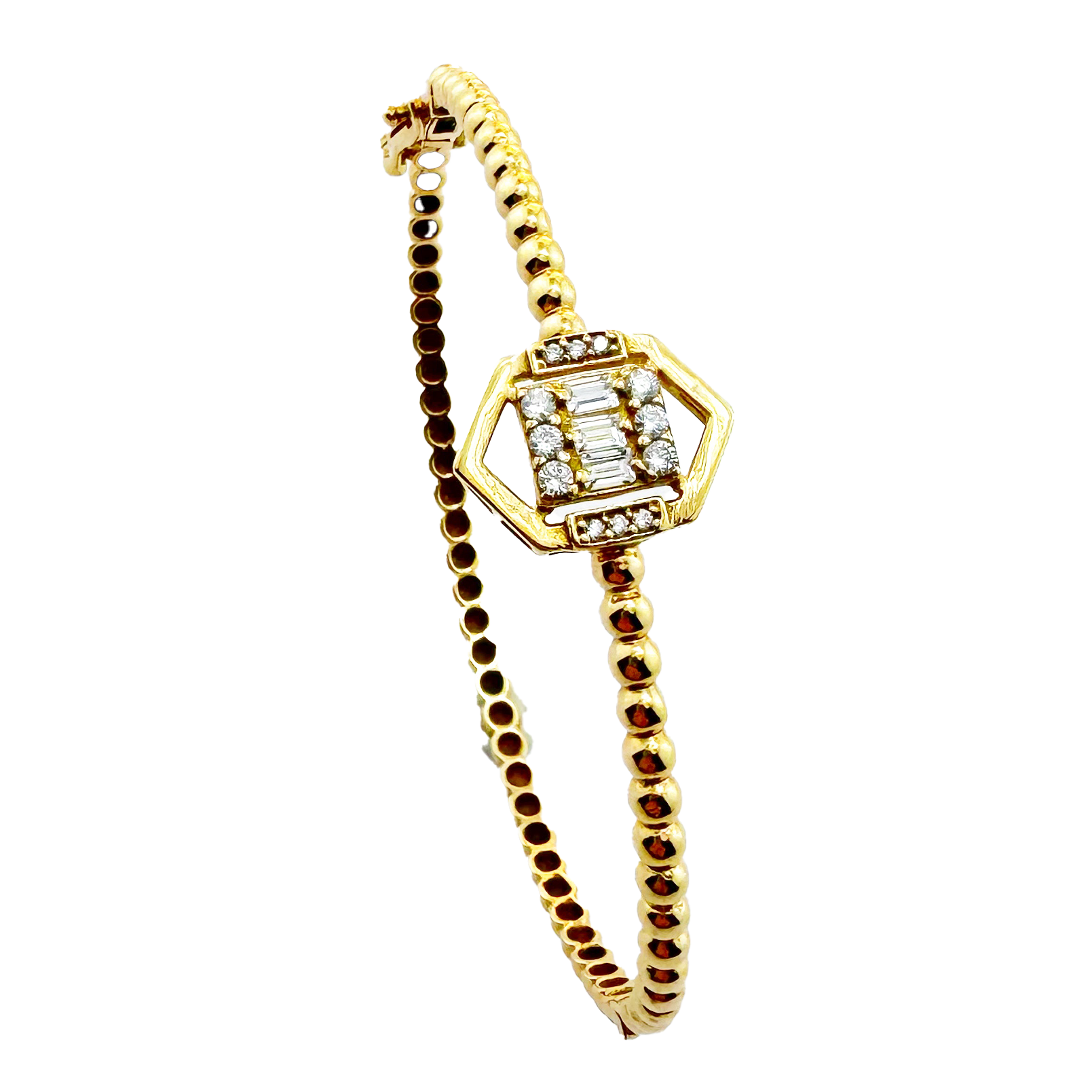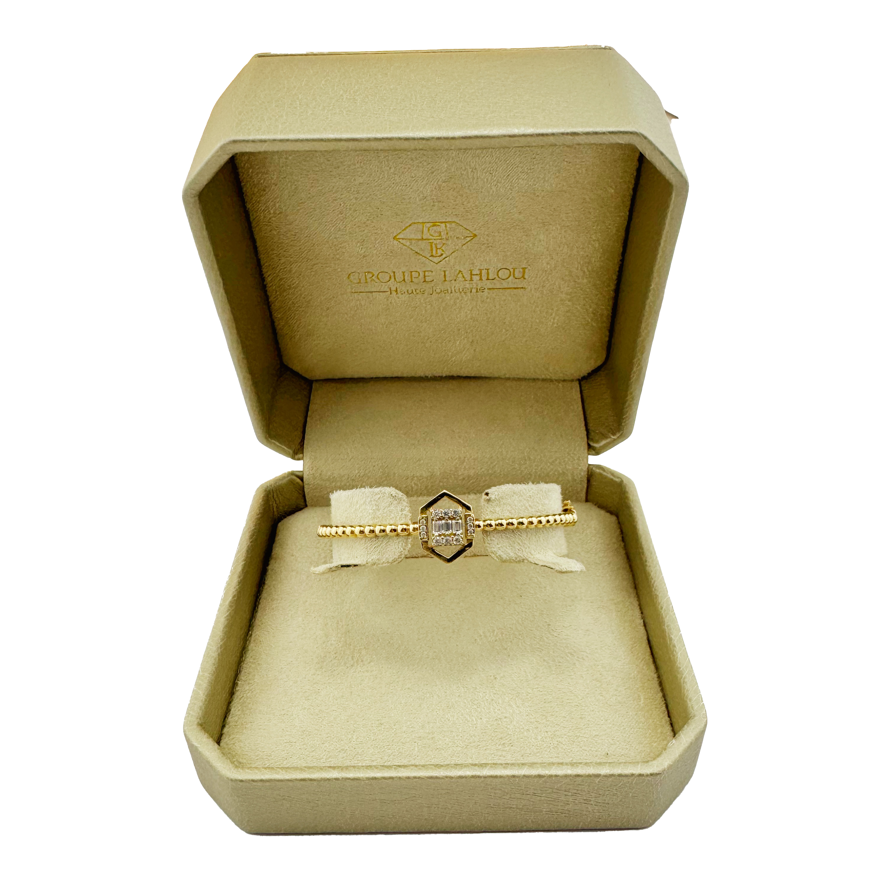 Ce bracelet raffiné en or 18K, orné d’un sublime motif serti de pierres scintillantes, allie finesse et luxe. Son design délicat et moderne en fait un bijou intemporel à porter en toute occasion. Avec des designs spéciaux pour toutes les femmes qui veulent se faire plaisir ; C'est un produit fabriqué en Or 750/1000 par l'artisanat marocain haute qualité de notre maison GROUPE LAHLOU, qui raconte les histoires de bonheur dans les cadeaux reçus par ceux qui veulent gâter leur femme, mère, petite amie, fille, amie ou vous même surtout.