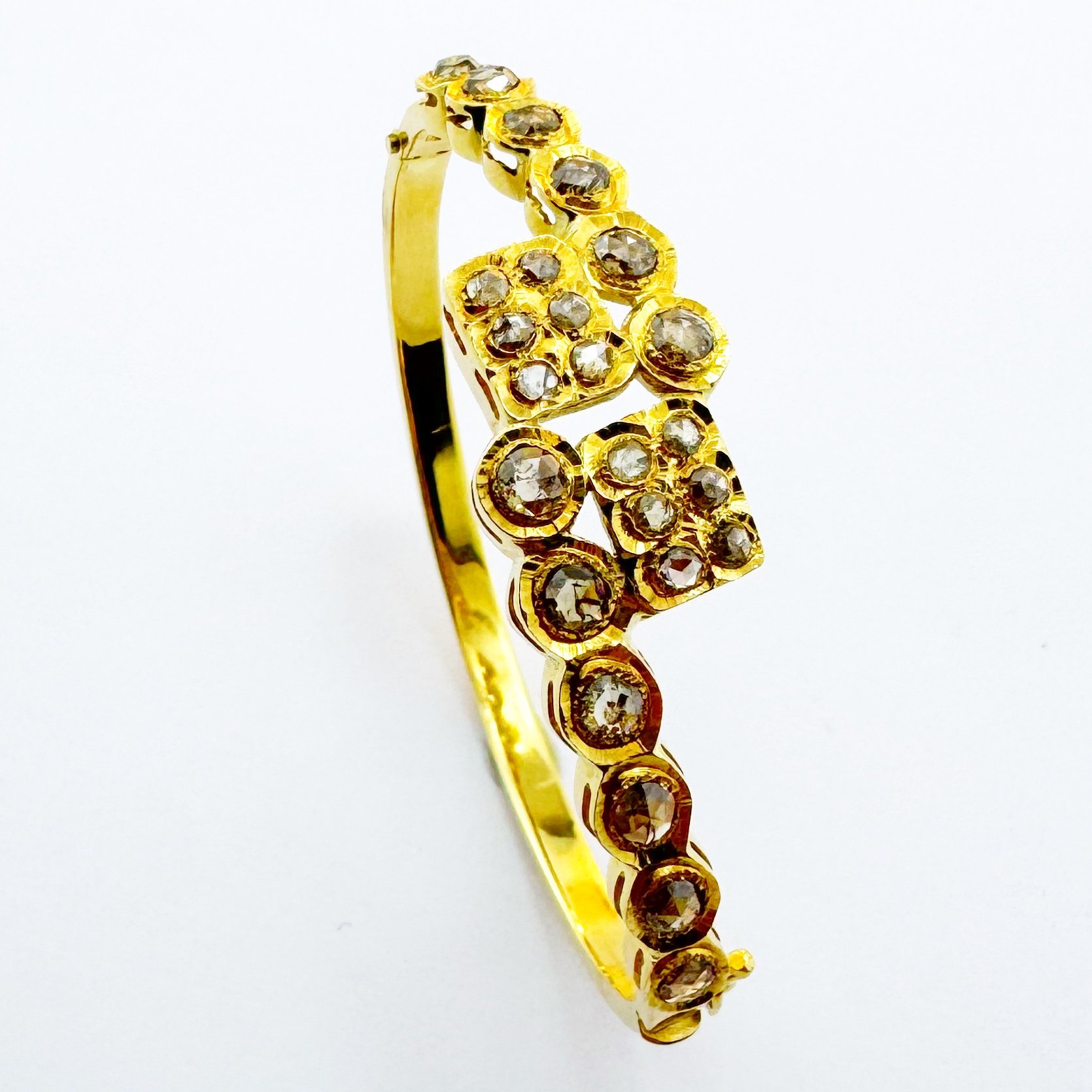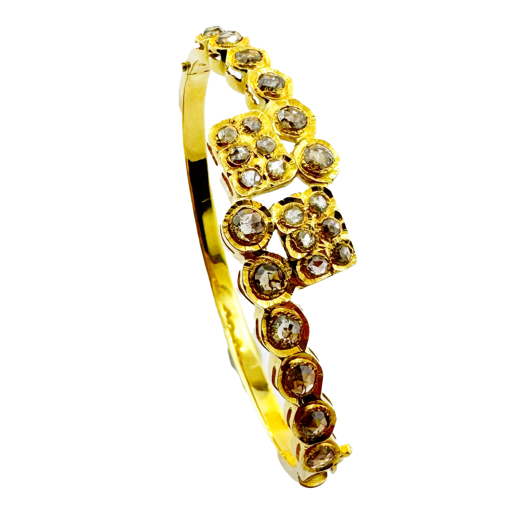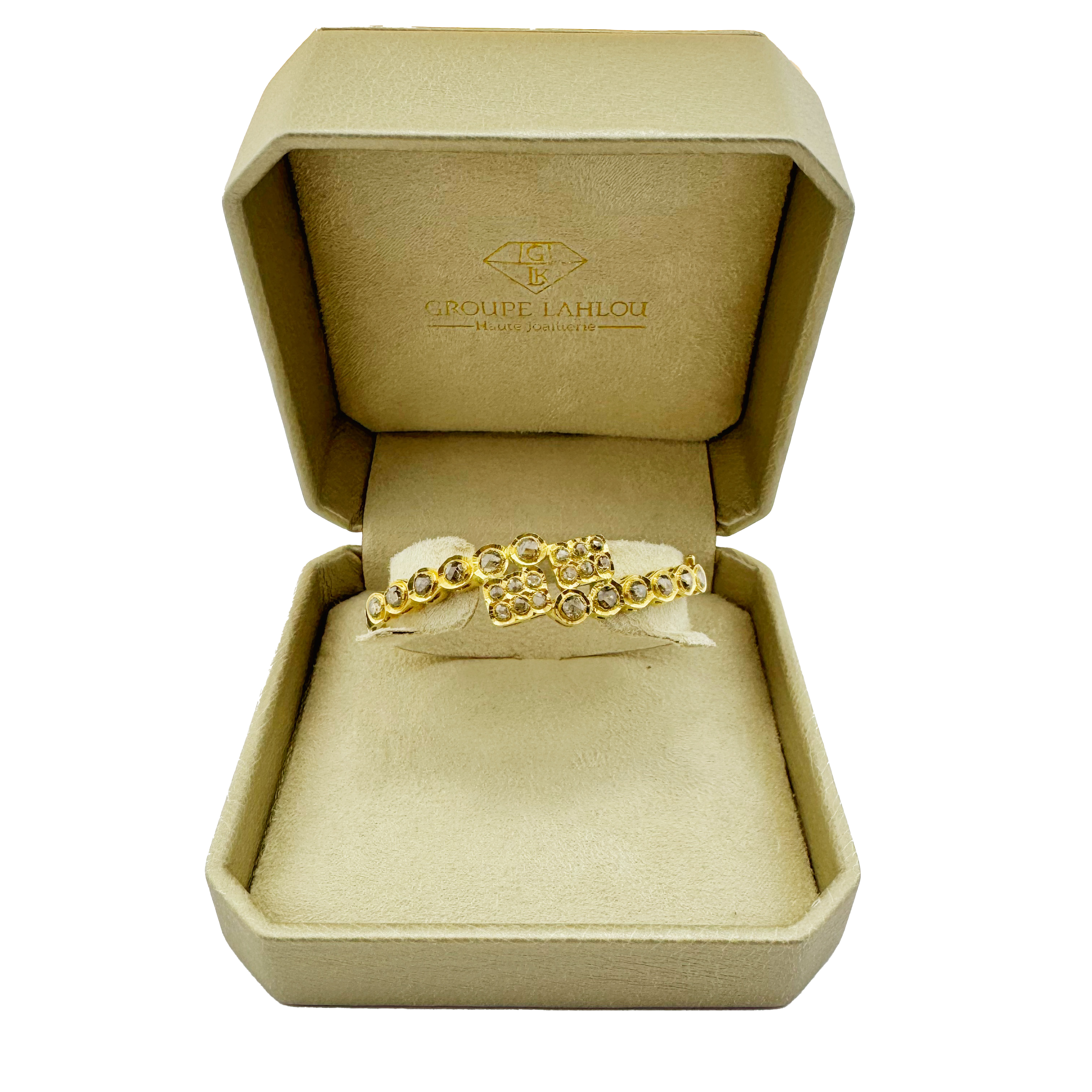 Bracelet en or jaune 18 carats ornée de pierres précieuses, un bijou qui incarne l'élégance marocaine. Son design raffiné, alliant motifs géométriques et éclats scintillants, attire tous les regards. Fabriquée avec soin.