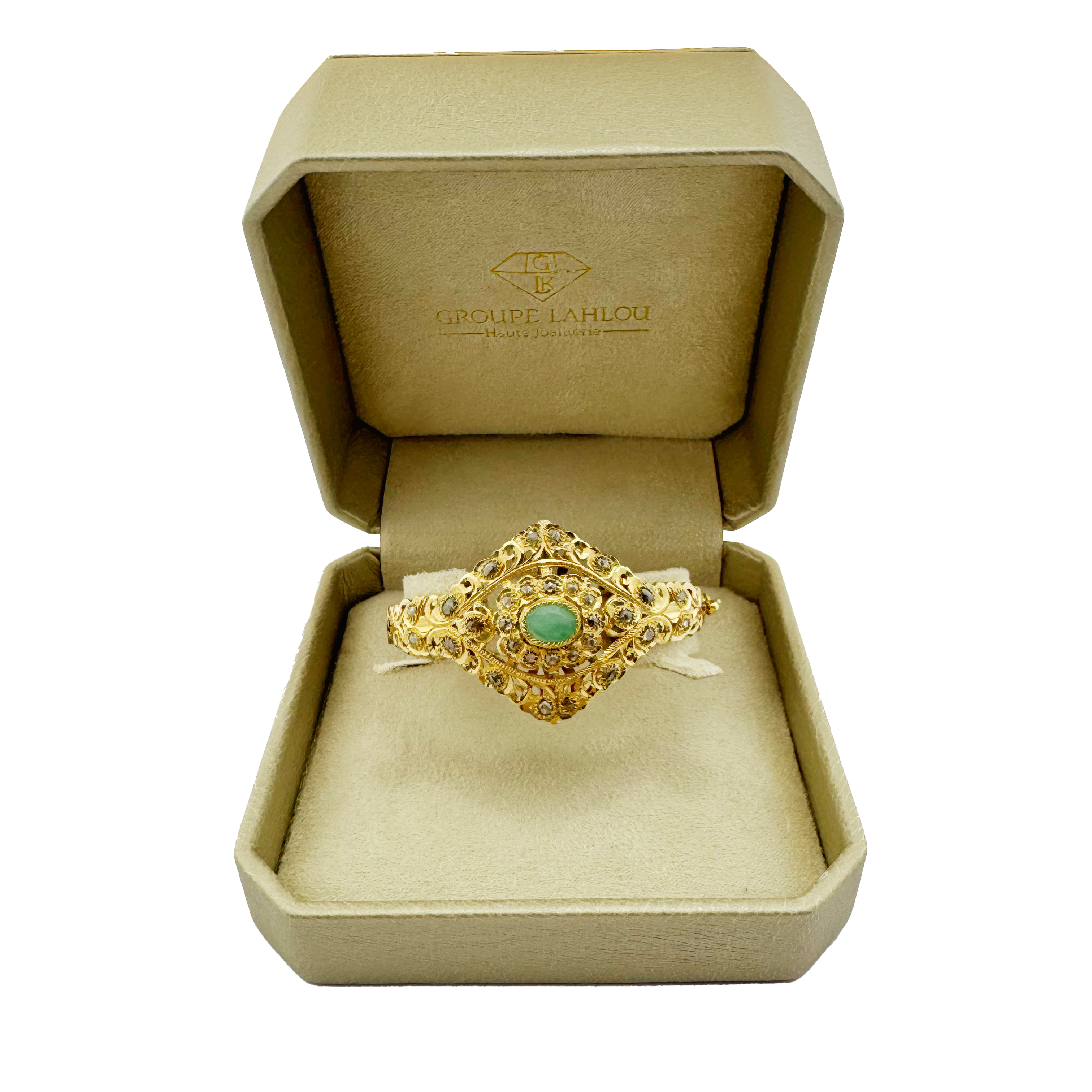 Offrez-vous un bijou d'exception avec ce somptueux bracelet en or massif 18 carats , une véritable œuvre d'art inspirée de l' artisanat marocain traditionnel . Confectionné avec soin par des artisans joailliers marocains , ce bracelet reflète le raffinement du patrimoine culturel marocain , alliant élégance, prestige et savoir-faire ancestral.