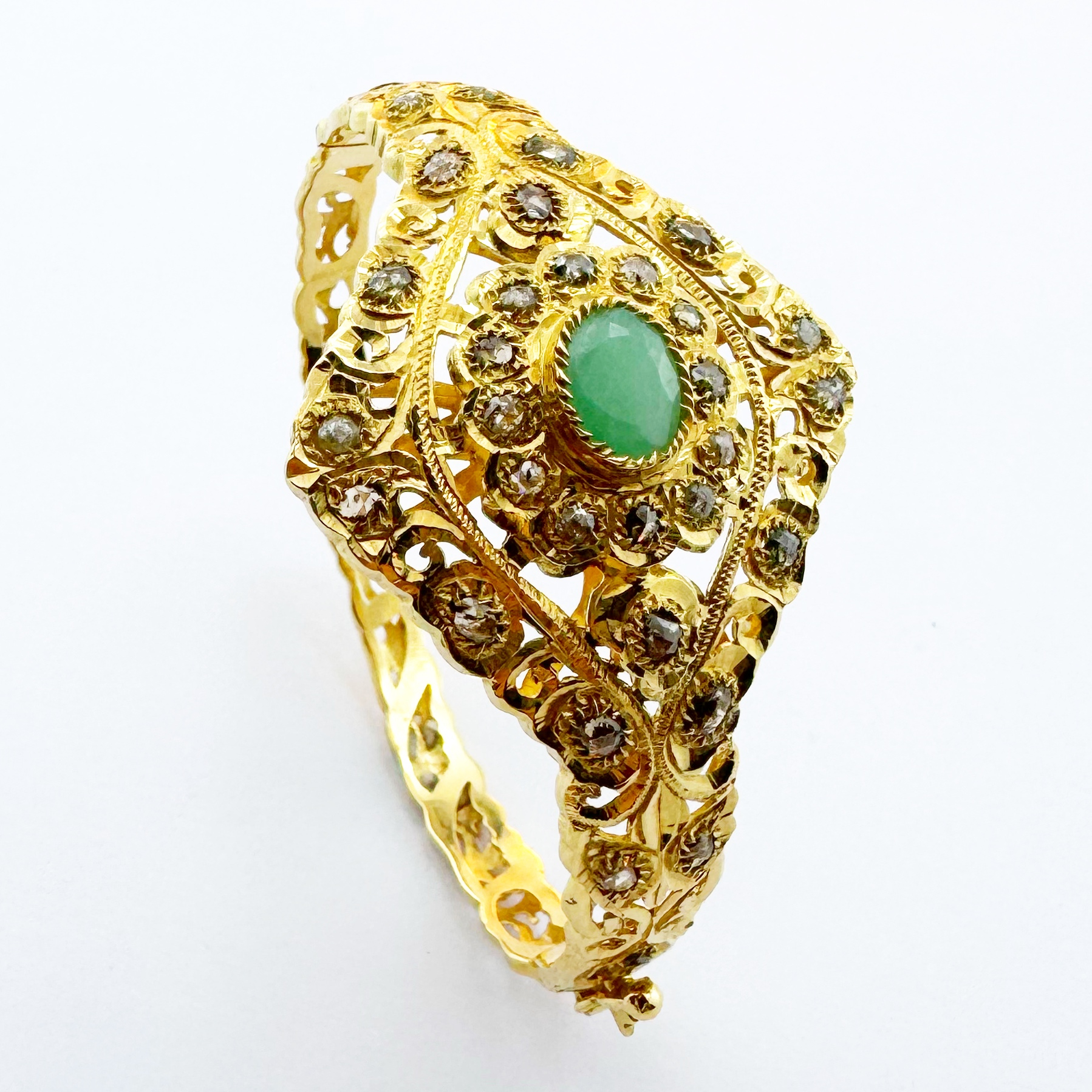 Au centre de ce bracelet luxueux , une émeraude ovale naturelle captive le regard par sa teinte verte profonde, symbole de renouveau et d'harmonie. Elle est entourée d'un élégant motif floral serti de zircons étincelants , apportant brillance et éclat à l'ensemble de la pièce.
