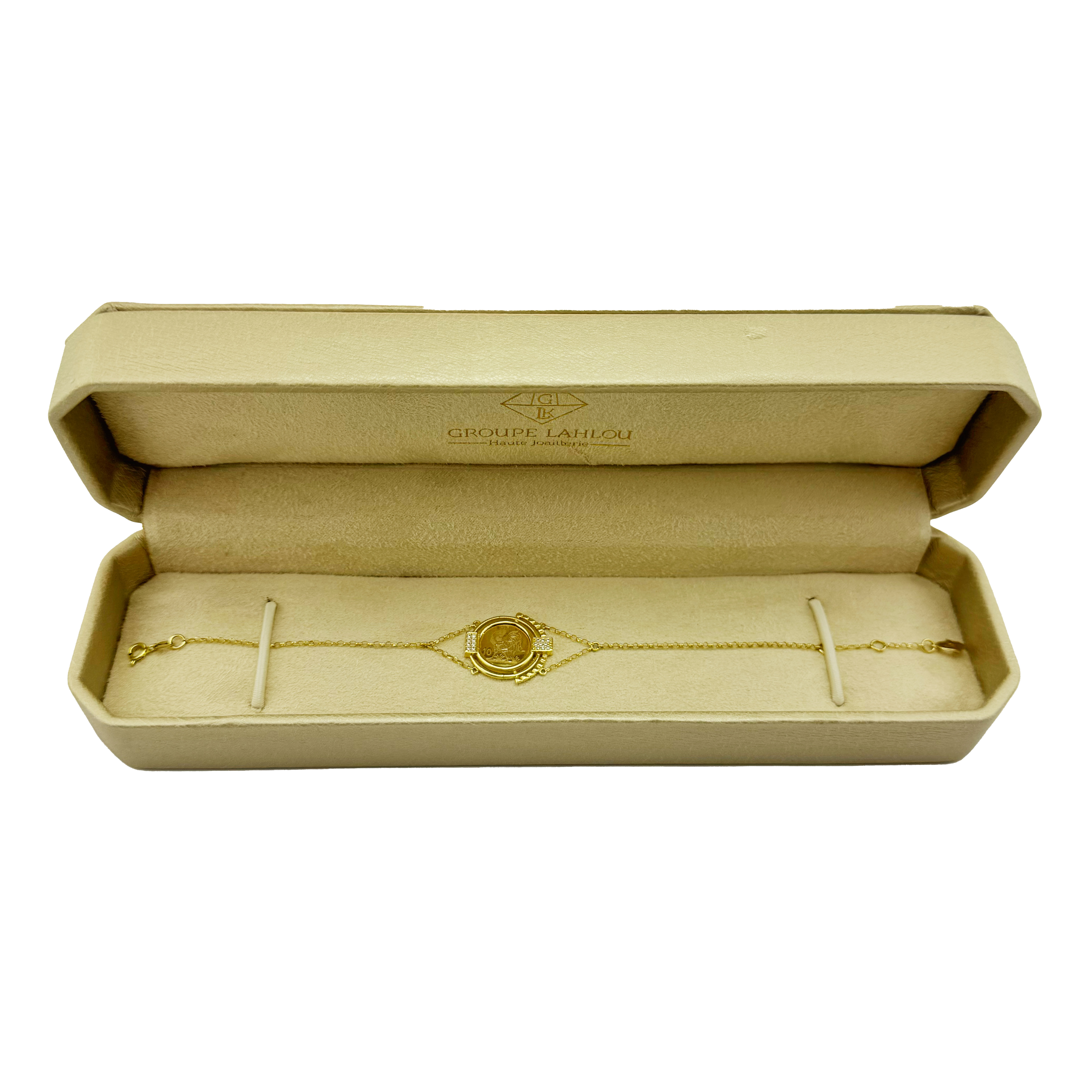 Au cœur de ce bijou se trouve une pièce emblématique représentant un Coq gaulois est un des symboles allégoriques et un des emblèmes de la France, symbole de force, de liberté et d'identité berbère. Elle est délicatement intégrée à une monture circulaire minimaliste qui met en valeur la richesse de l’histoire monétaire marocaine. Cette gourmette est montée sur une chaîne fine ajustable en Or de pureté 750/1000 certifié, qui épouse le poignet avec légèreté et confort. Les finitions dorées ajoutent une lueur chaleureuse et précieuse, idéale pour les grandes occasions comme pour le quotidien.