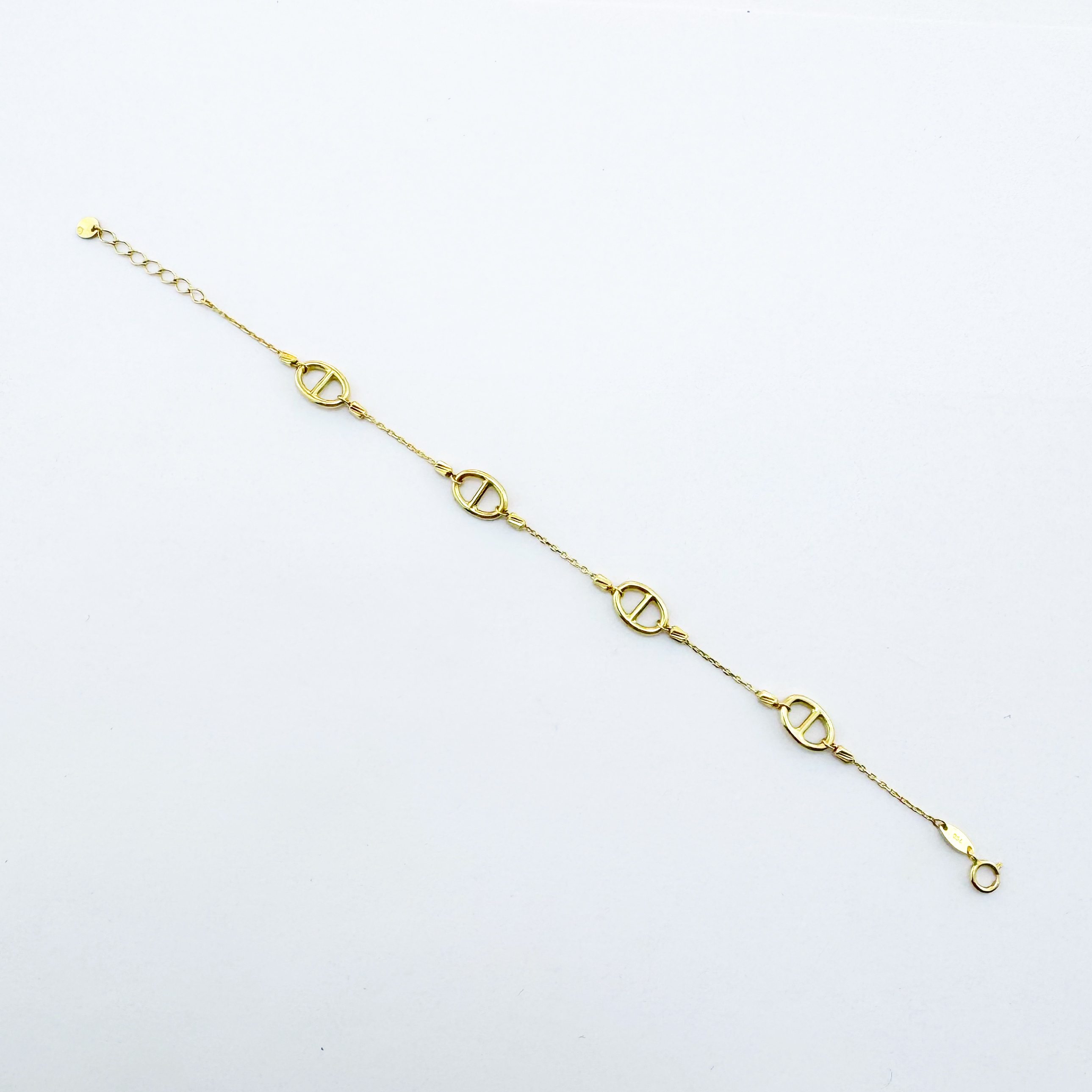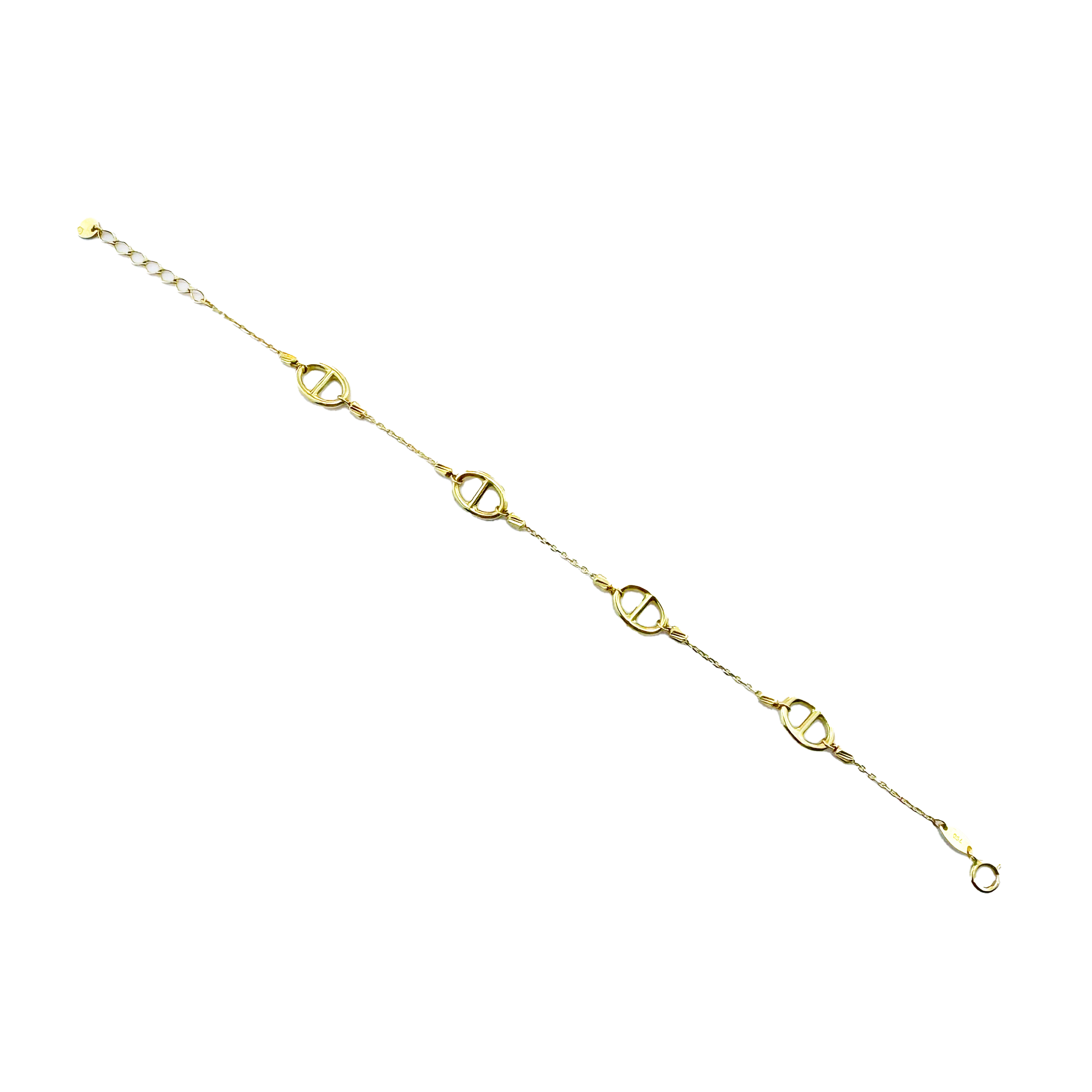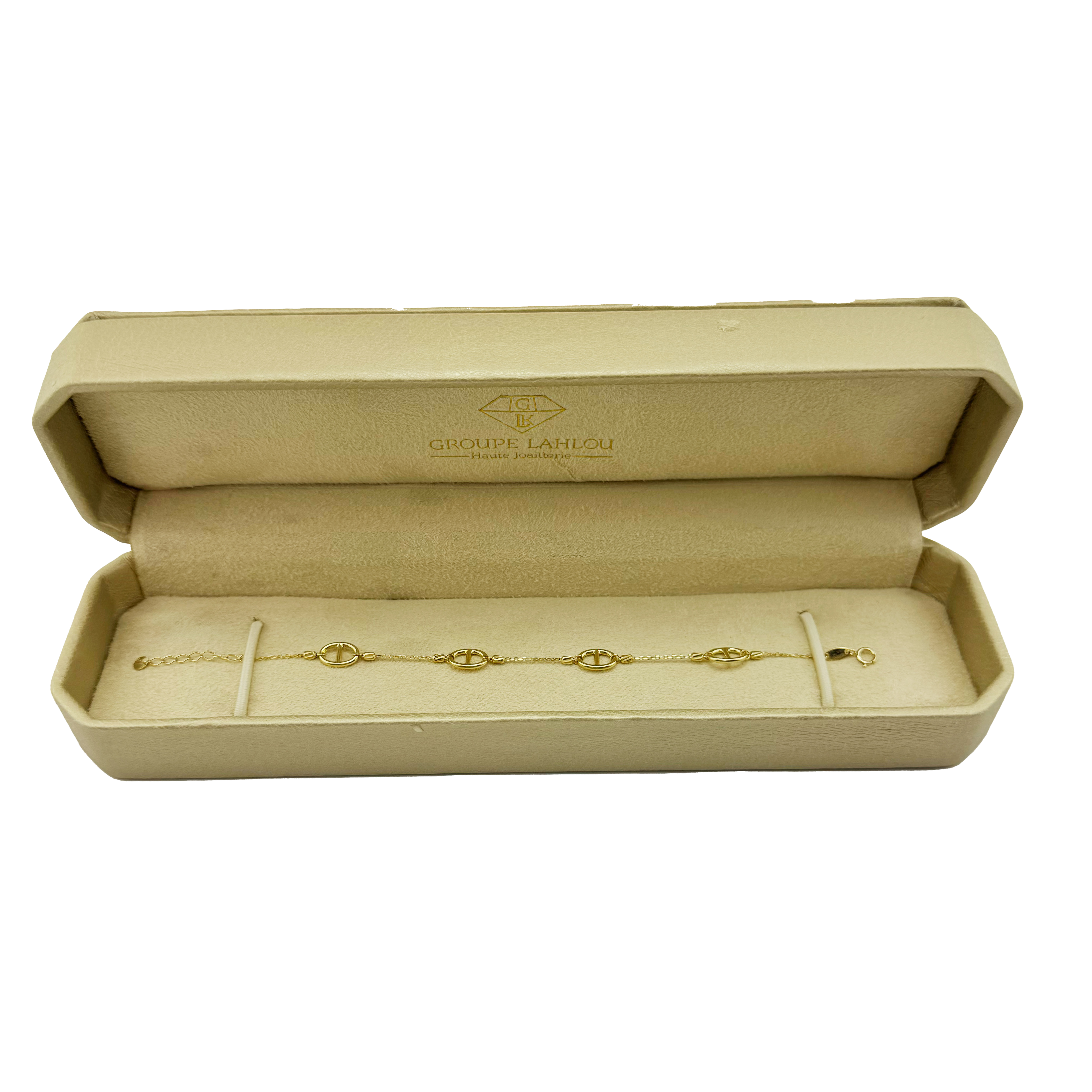 Composée d’une délicate chaîne dorée en Or de pureté 750/1000 certifié ornée de motifs en forme d’anneaux ovales traversés par une barre horizontale, cette gourmette reprend le style emblématique de la chaîne marine, souvent associée à l’ancrage, la force intérieure et la liberté. Chaque maillon évoque la connexion entre les éléments, la stabilité et le mouvement – des valeurs chères aux femmes audacieuses, libres et ancrées dans leurs convictions.
