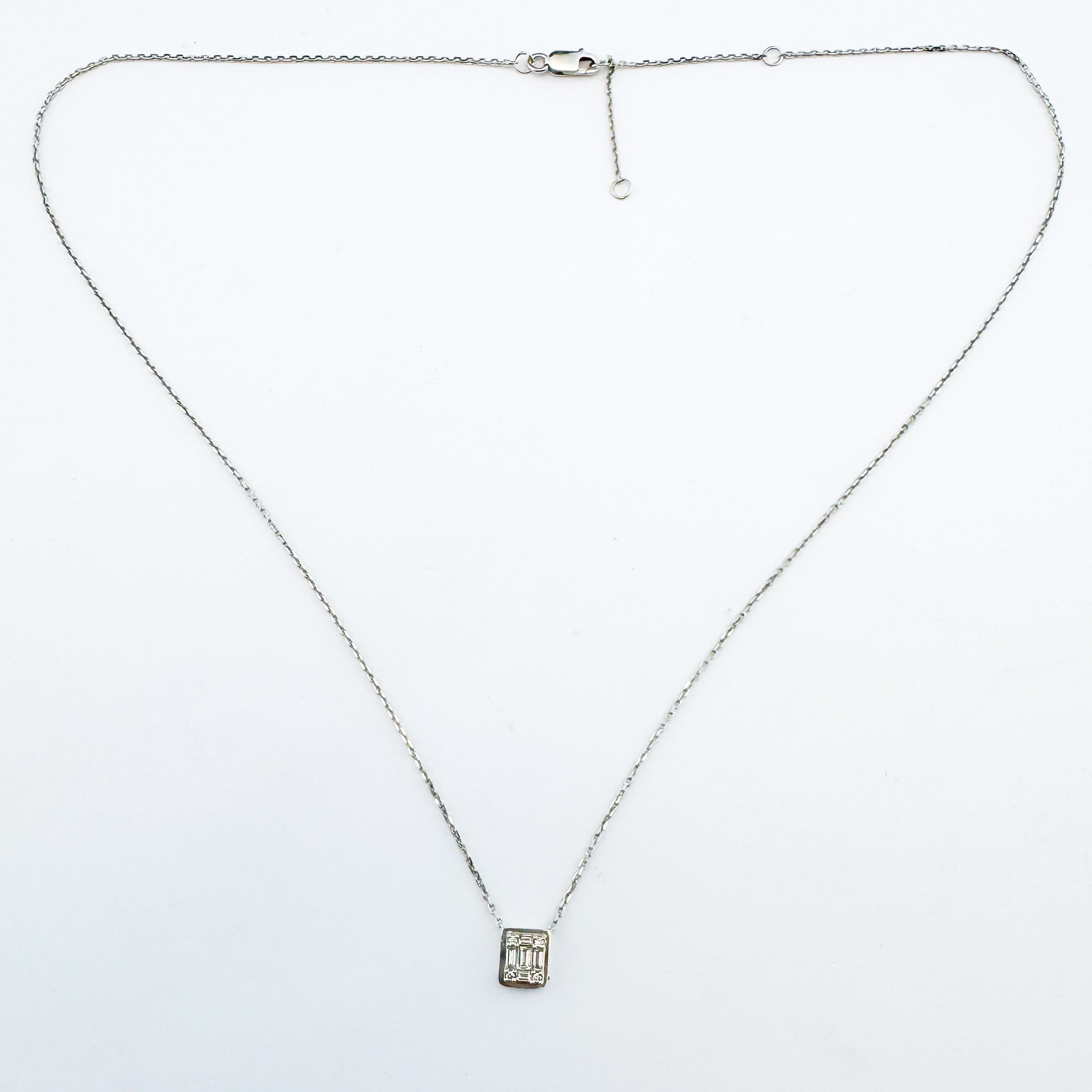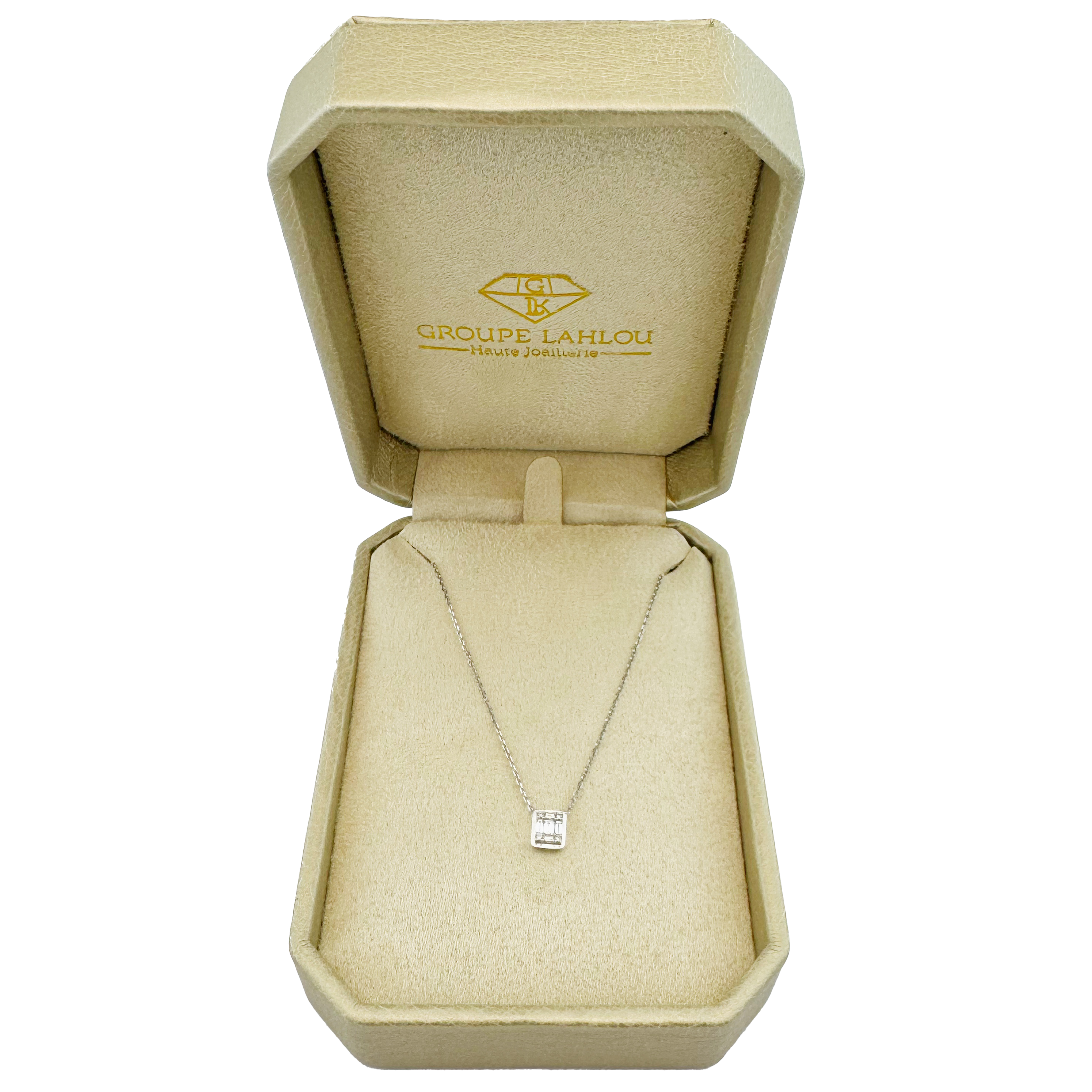Ce collier femme en or blanc 18 carats incarne la quintessence de l’élégance contemporaine. Orné d’un pendentif rectangulaire serti de diamants naturels taille baguette, il séduit par sa simplicité géométrique et son éclat sophistiqué.