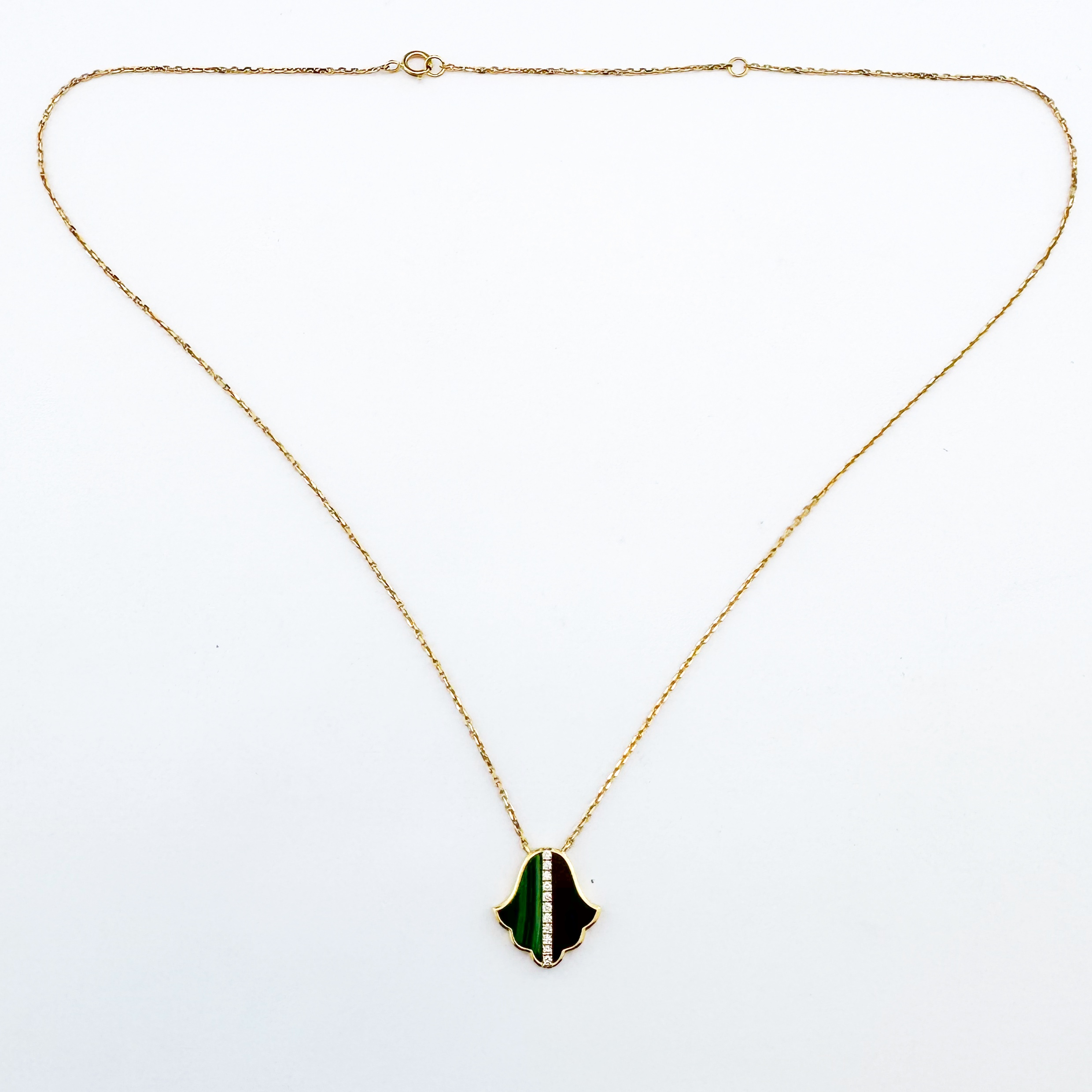 Ce collier en or jaune 18 carats sublime l’art du contraste et du détail précieux. Son pendentif unique, à la forme khamsa, marie avec audace émail vert et brun profond, souligné par une ligne verticale de diamants naturels certifiés.