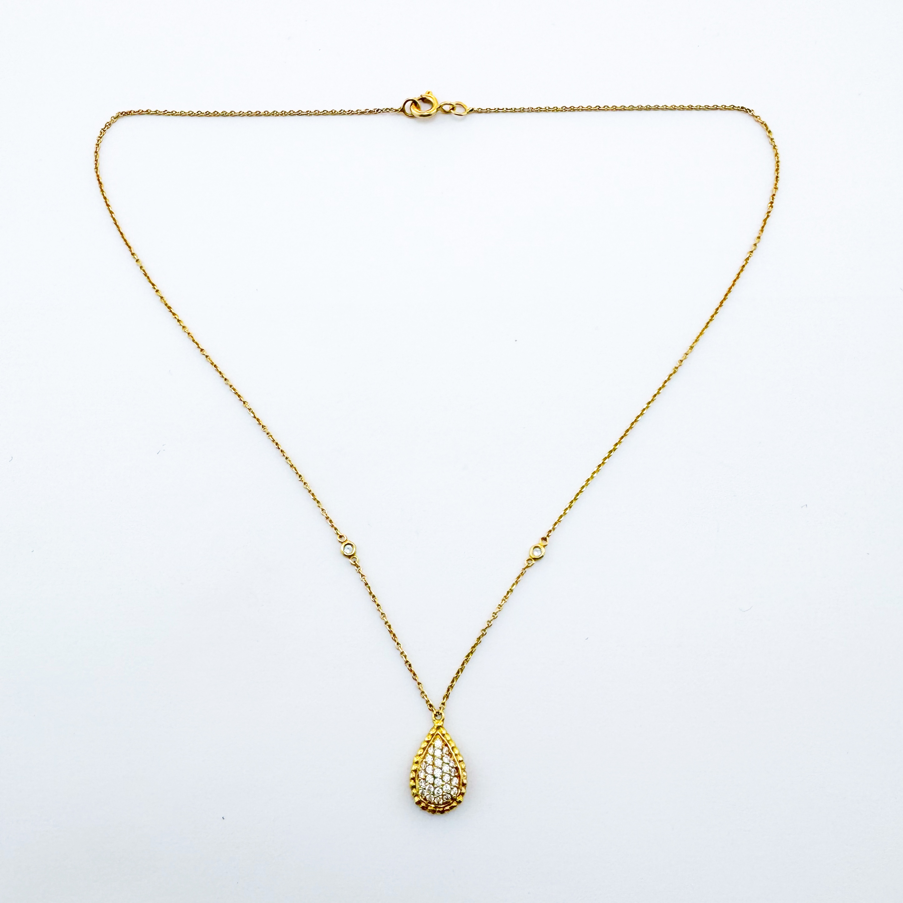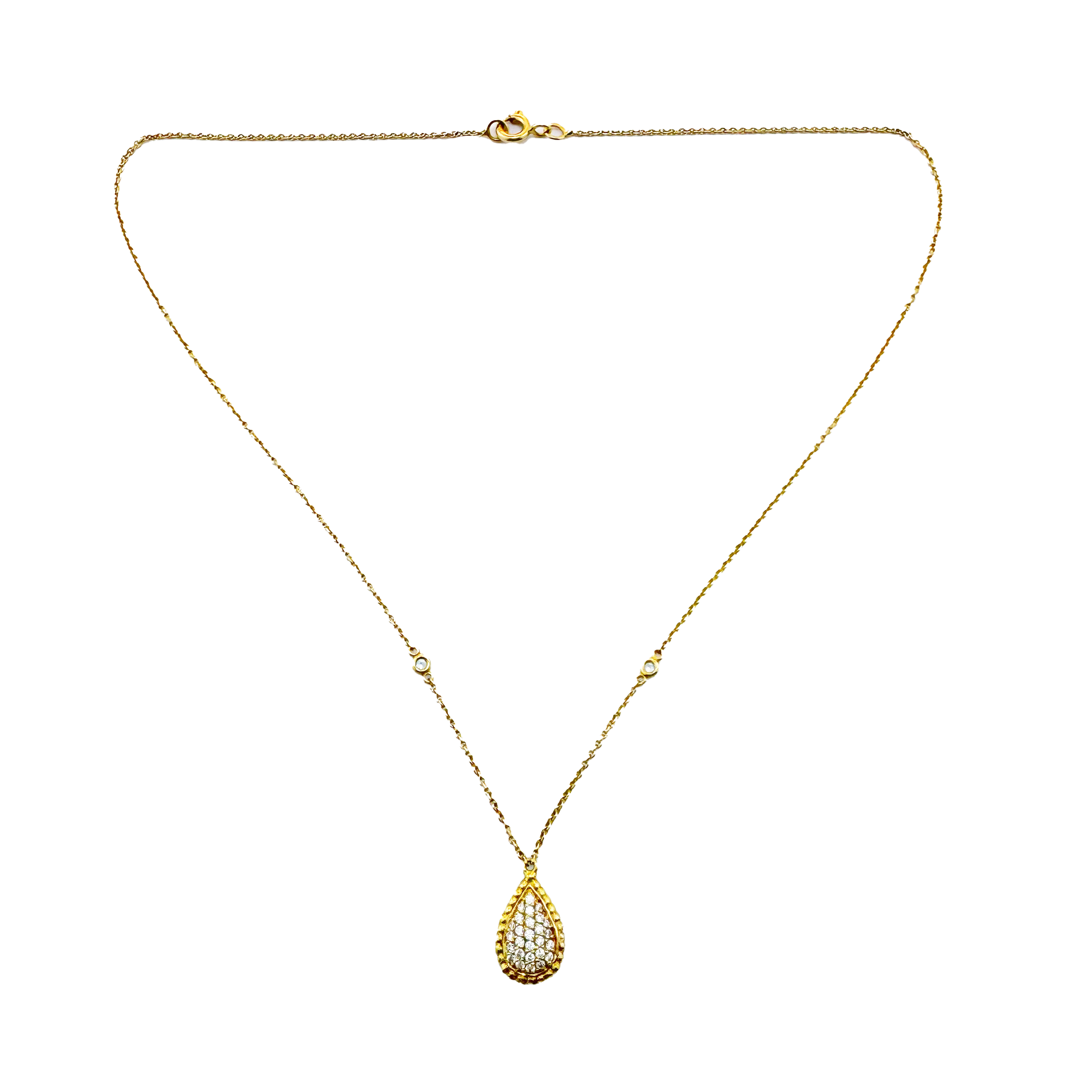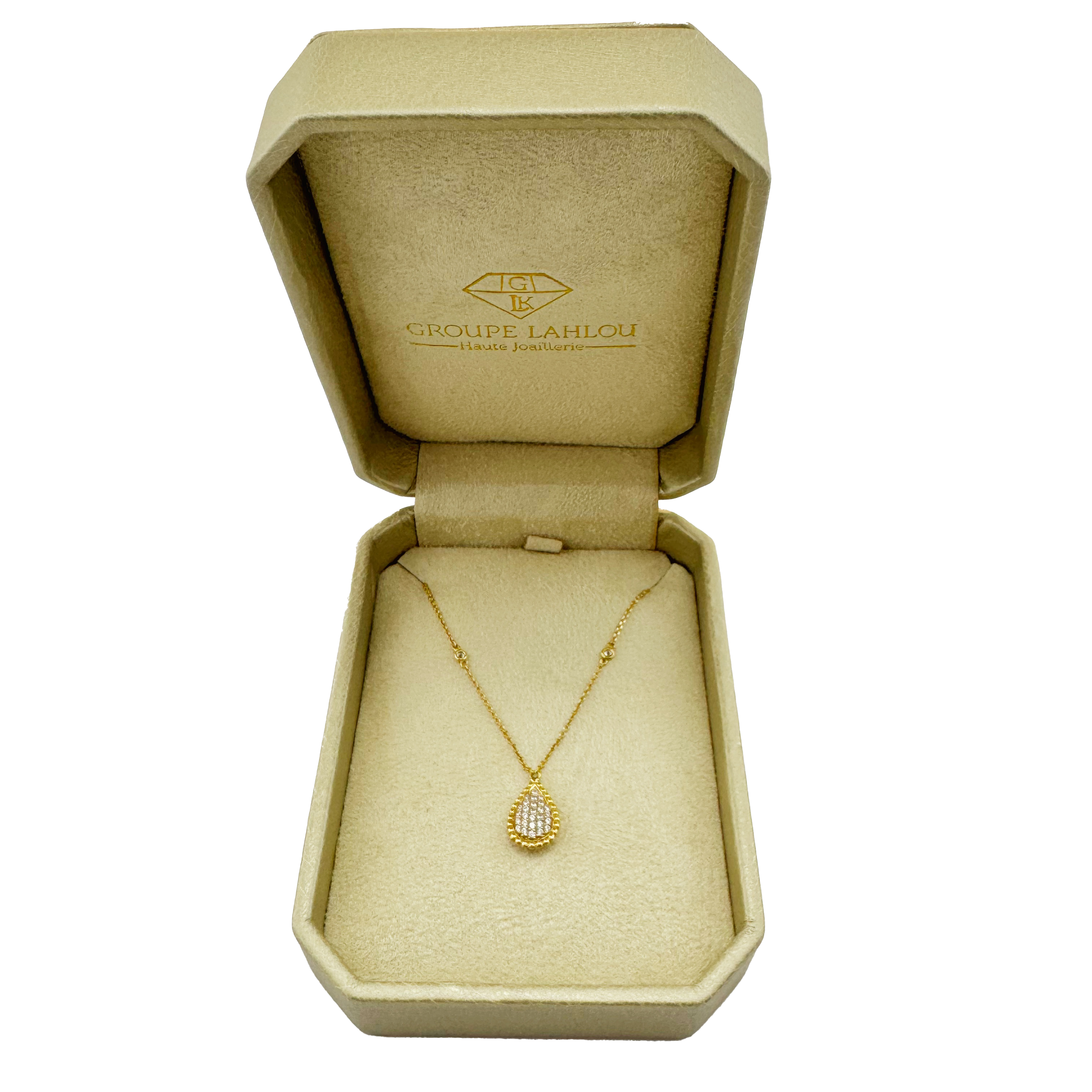Collier en or jaune 18 carats pour femme, sublimé par un pendentif en forme de poire finement travaillé incarne la distinction du savoir-faire de la maison Groupe Lahlou. Le médaillon se détache et peut se porter en gourmette.