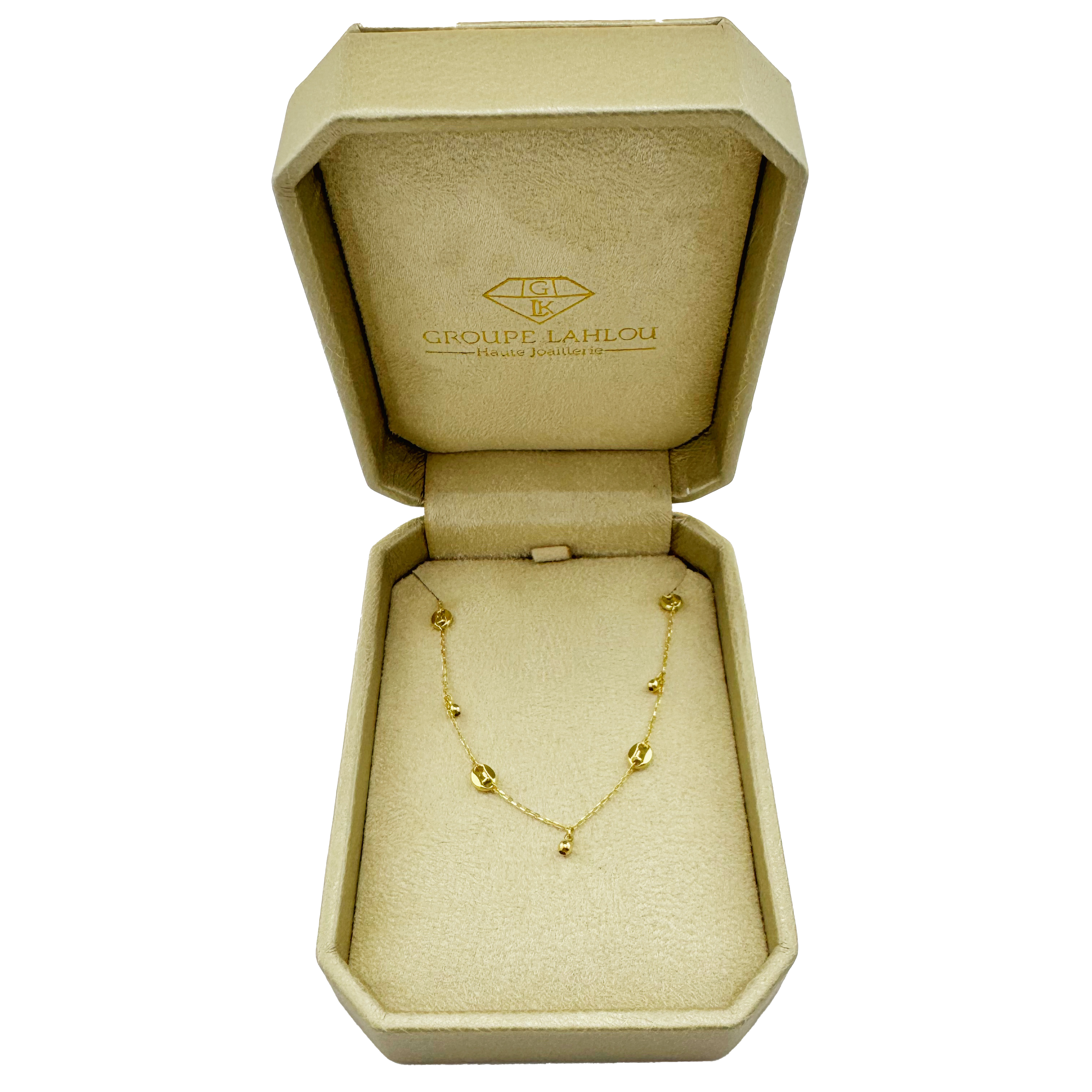 Chaque pendentif, en forme de goutte d’eau stylisée et graines de café, est positionné à intervalles réguliers sur une chaîne en or 18K délicatement torsadée, créant un effet de mouvement et de brillance à chaque geste. Son fermoir sécurisé et son design léger en font un bijou facile à porter au quotidien ou pour sublimer une tenue de soirée. Idéal comme cadeau pour femme, bijou de mariage, fiançailles ou anniversaire. En ligne avec une livraison gratuite partout au Maroc ou visiter notre Bijouterie Groupe Lahlou.