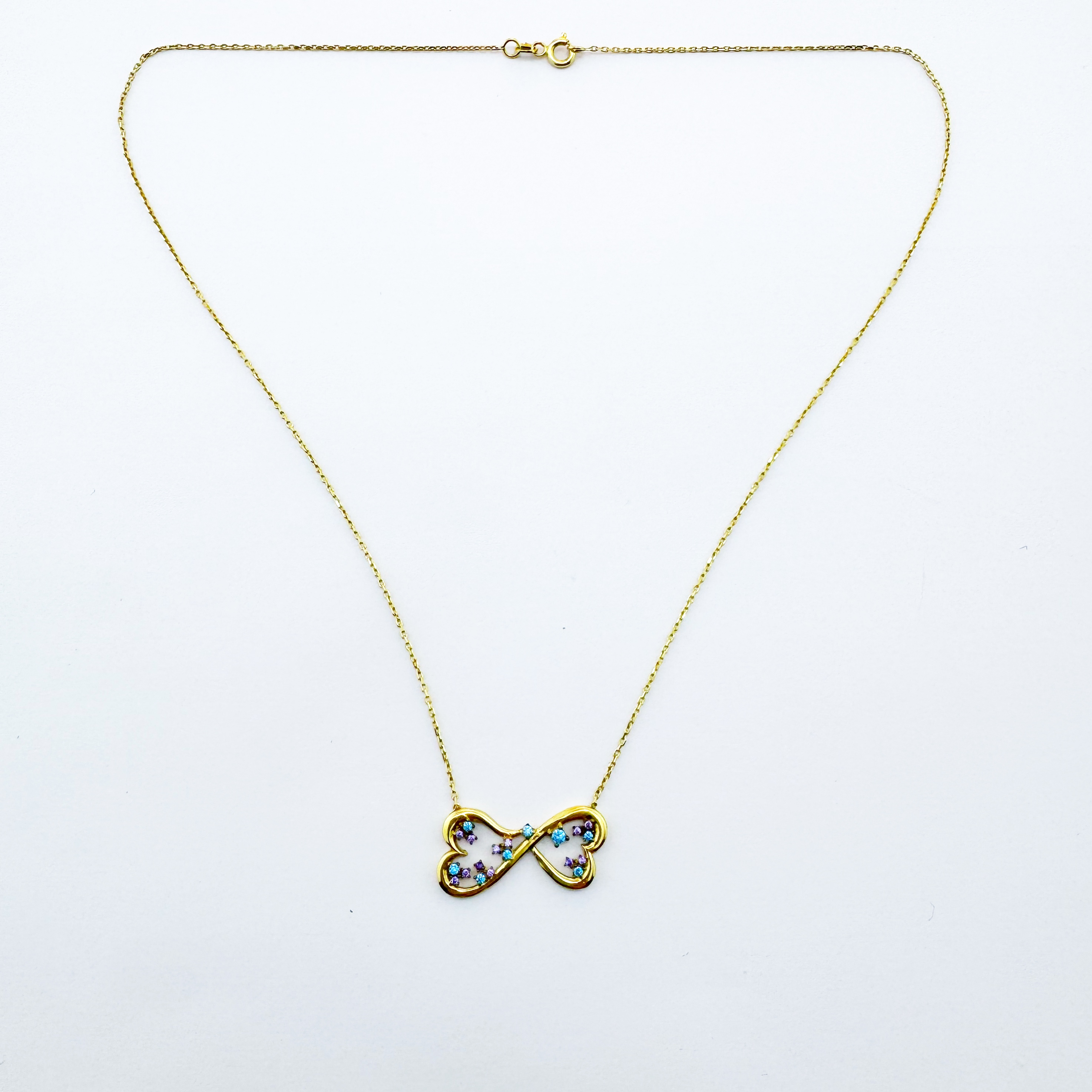 Collier femme en Or jaune 18 carats fin orné d’un pendentif en forme de deux cœurs infini, décoré de motifs floraux délicats multicolores. Fabriqué avec soin et beaucoup d'amour par nos meilleur artisanats marocains. Disponible dans notre Boutique de bijoux à Morocco Mall ou en commande en ligne avec livraison rapide, gratuite et sécurisée partout au Maroc.