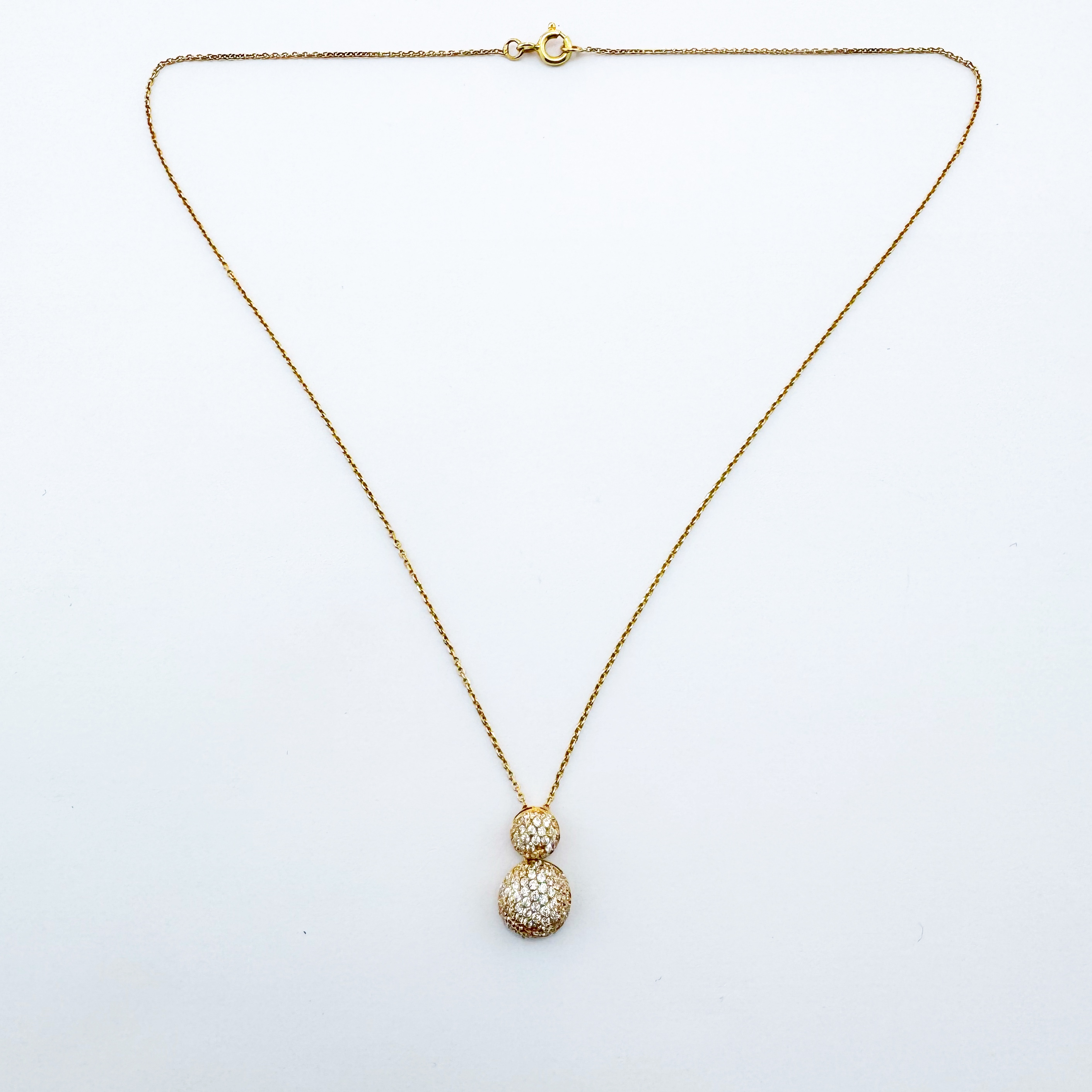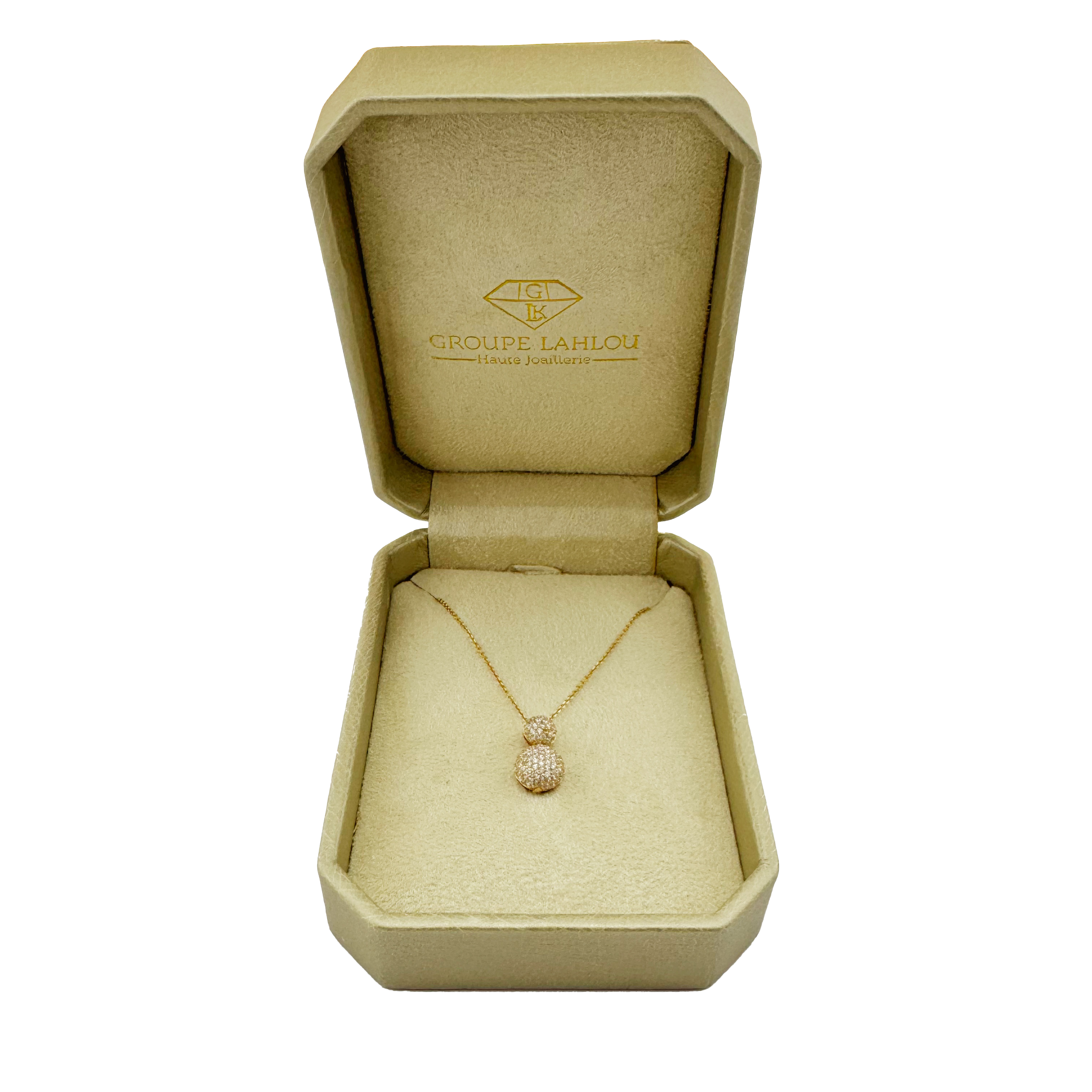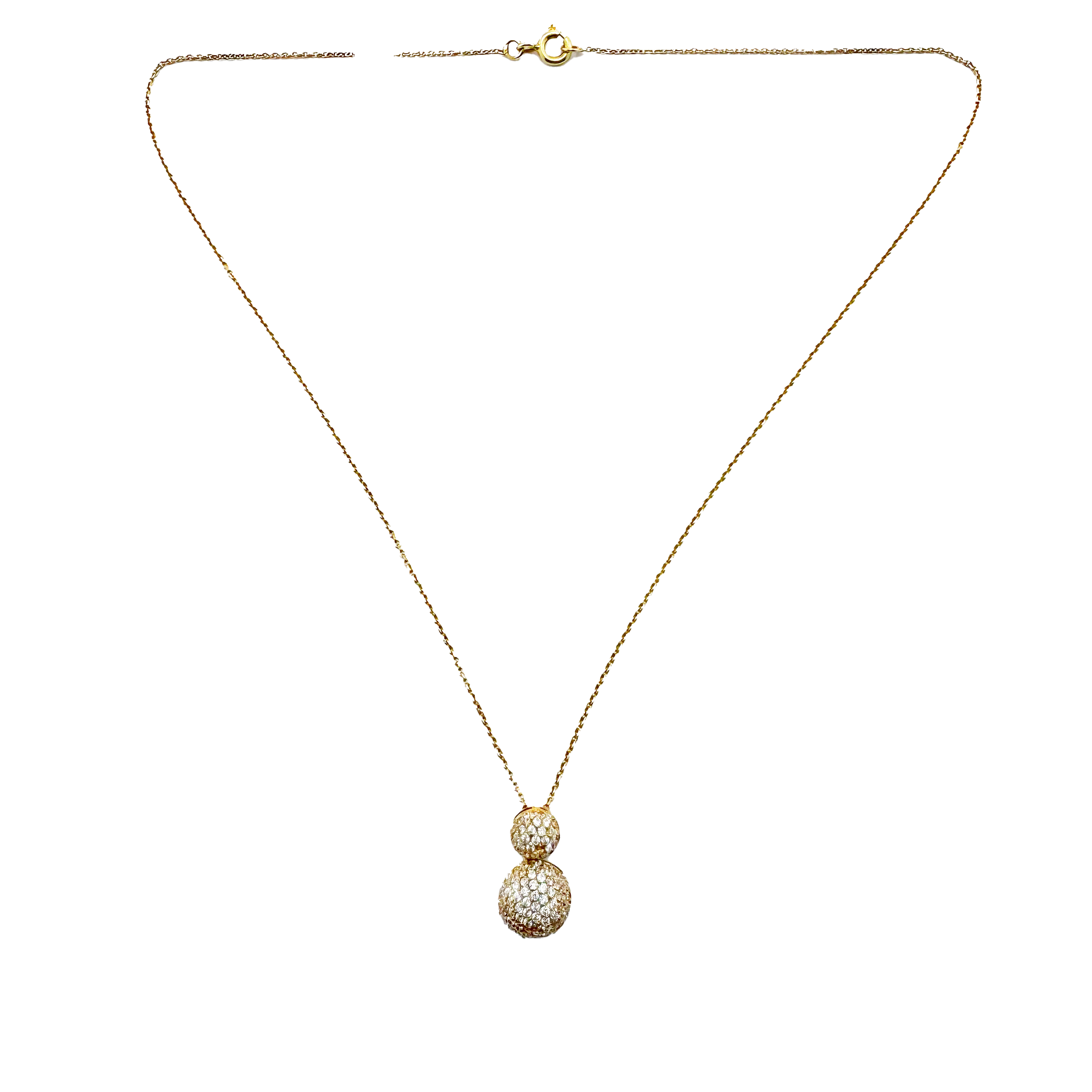 Laissez-vous séduire par la brillance éclatante de ce collier femme en Or jaune 18 carats avec pendentif en forme de double boule, entièrement serti de strass étincelants. Ce bijou en Or 750 sophistiqué incarne le raffinement et la féminité, idéal pour sublimer vos tenues de soirée ou apporter une touche glamour à un look quotidien.