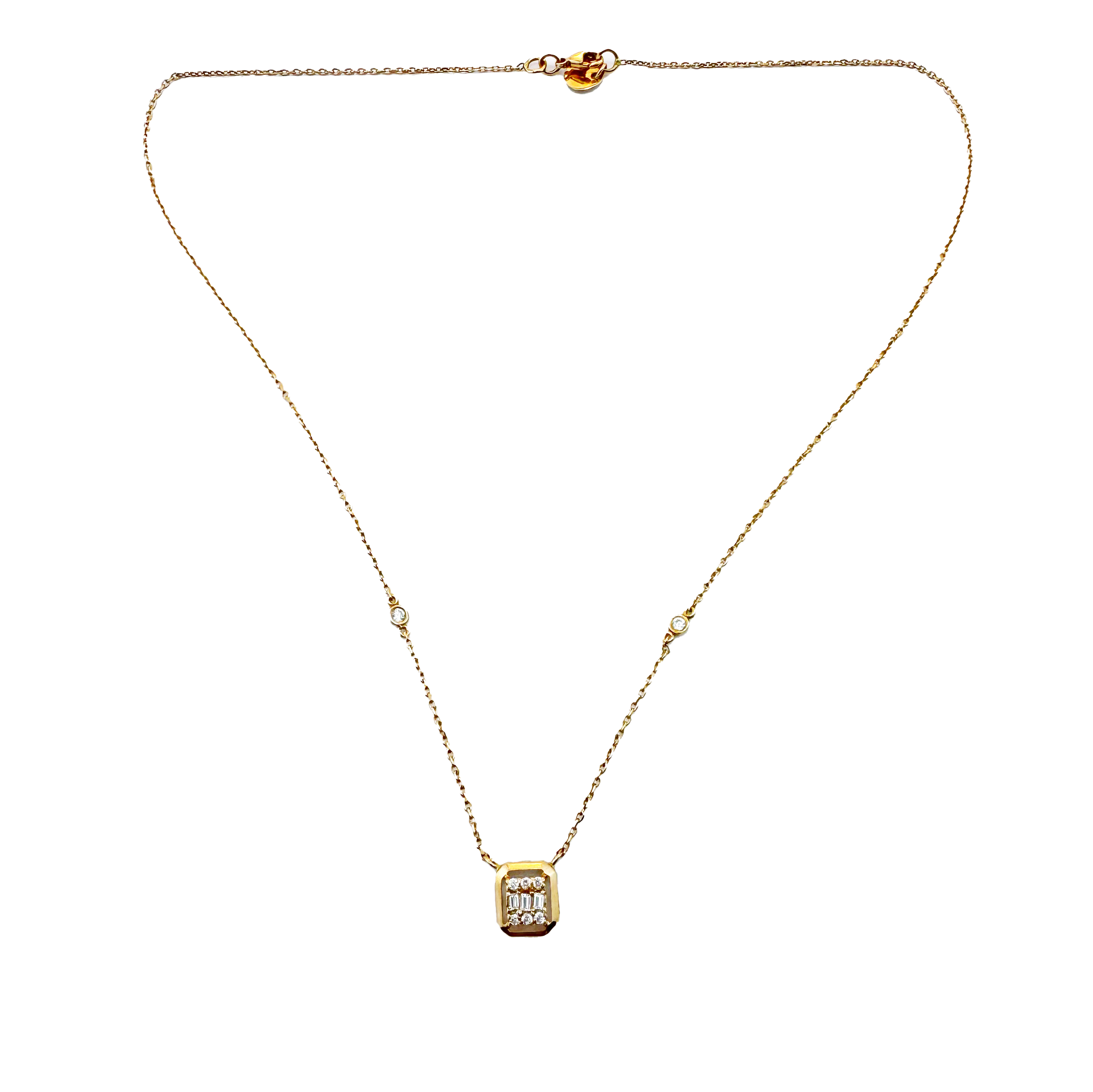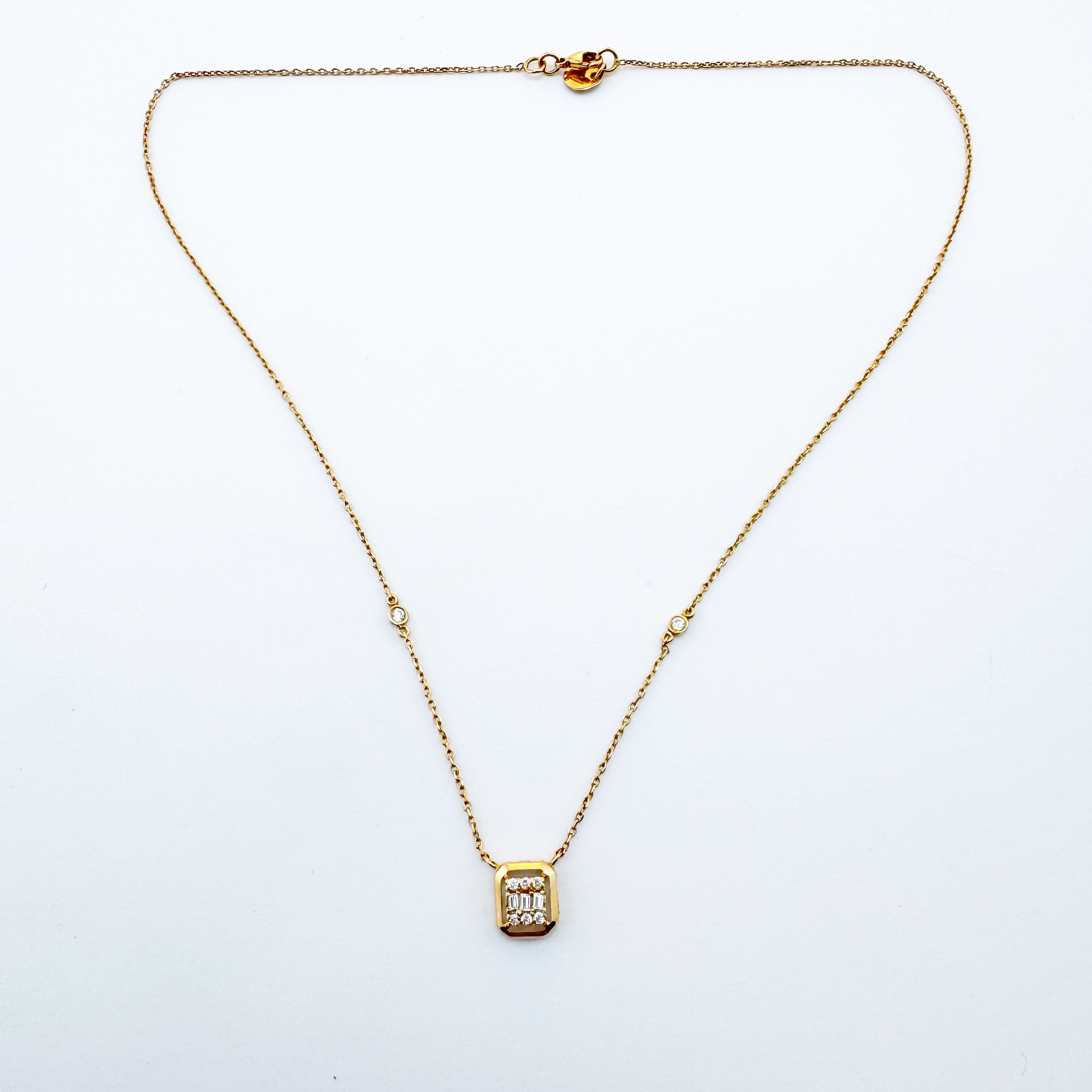 Ce collier moderne en or jaune 18 carats pour femme est une ode à la modernité et au raffinement. Son pendentif carré, orné de pierres fines façon diamilite baguettes et brillants. La chaîne fabriquée en Or 750/1000, fine et délicate. Le fermoir sécurisé permet un port quotidien tout en assurant élégance et confort.