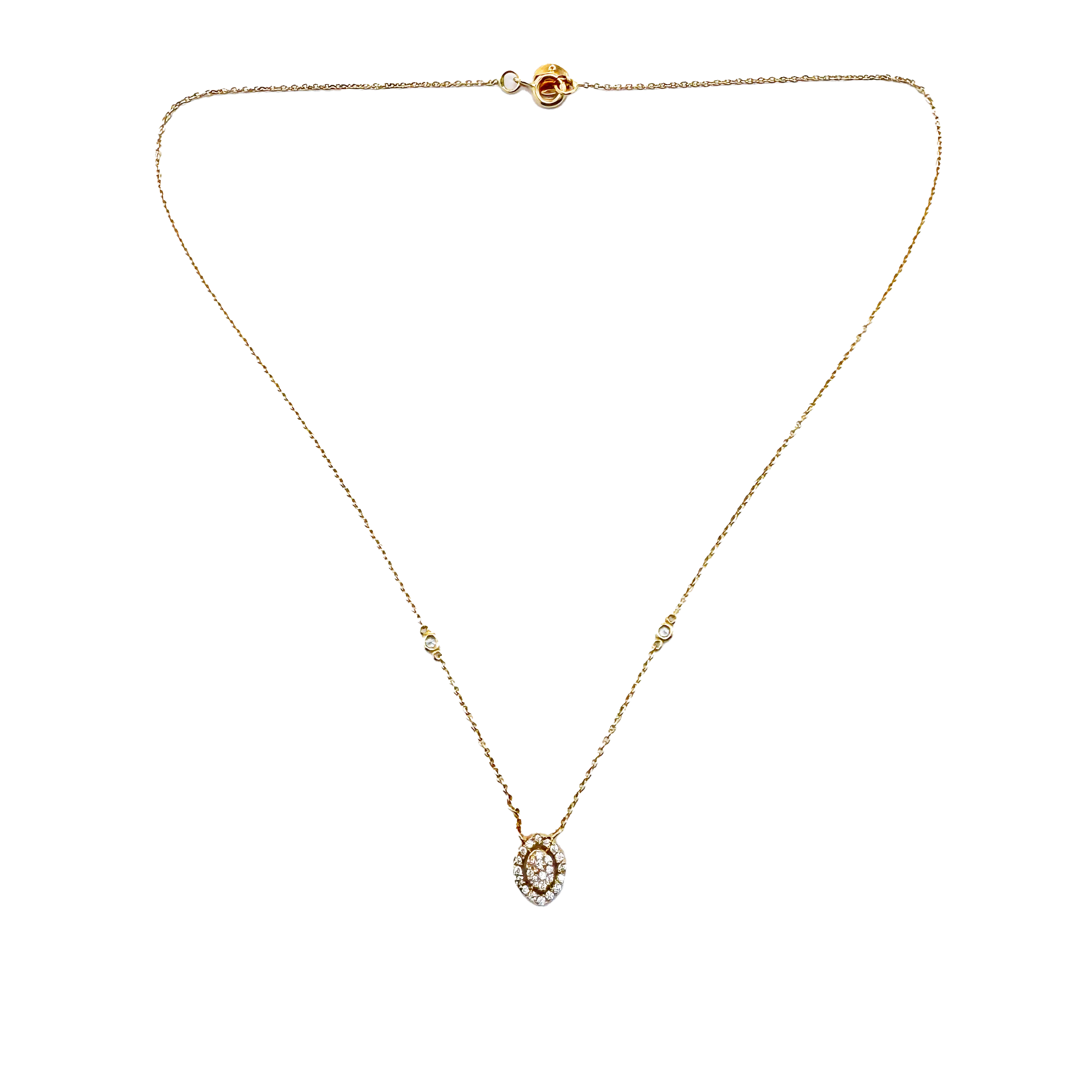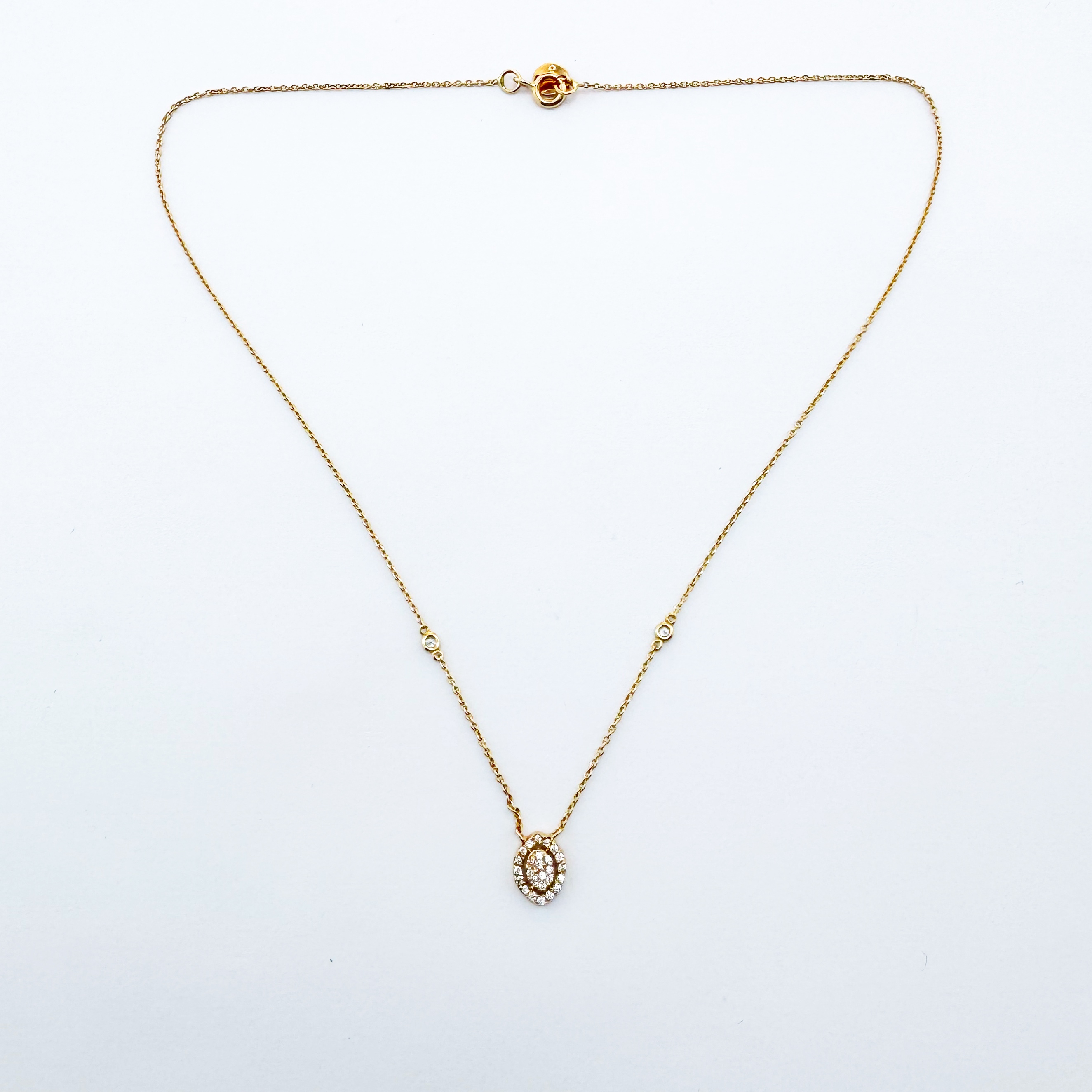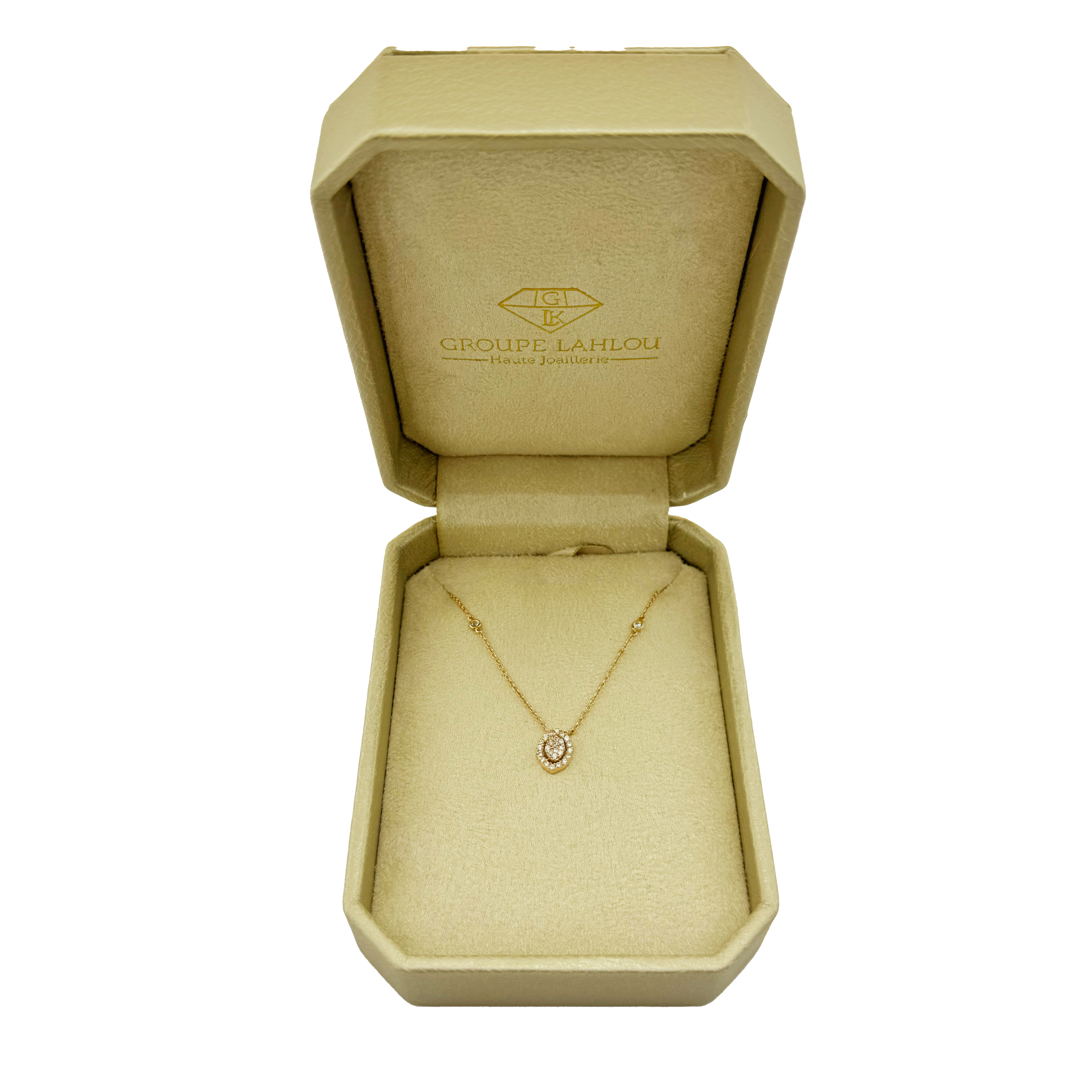 Ce somptueux collier femme moderne en Or jaune 18 carats incarne la grâce et l'élégance classiques avec une touche de modernité. Son pendentif ovale, finement orné de pierres scintillantes taillées en brillant, évoque la perfection naturelle et la pureté. Le contour pavé offre un éclat doux mais saisissant, capturant la lumière à chaque mouvement.