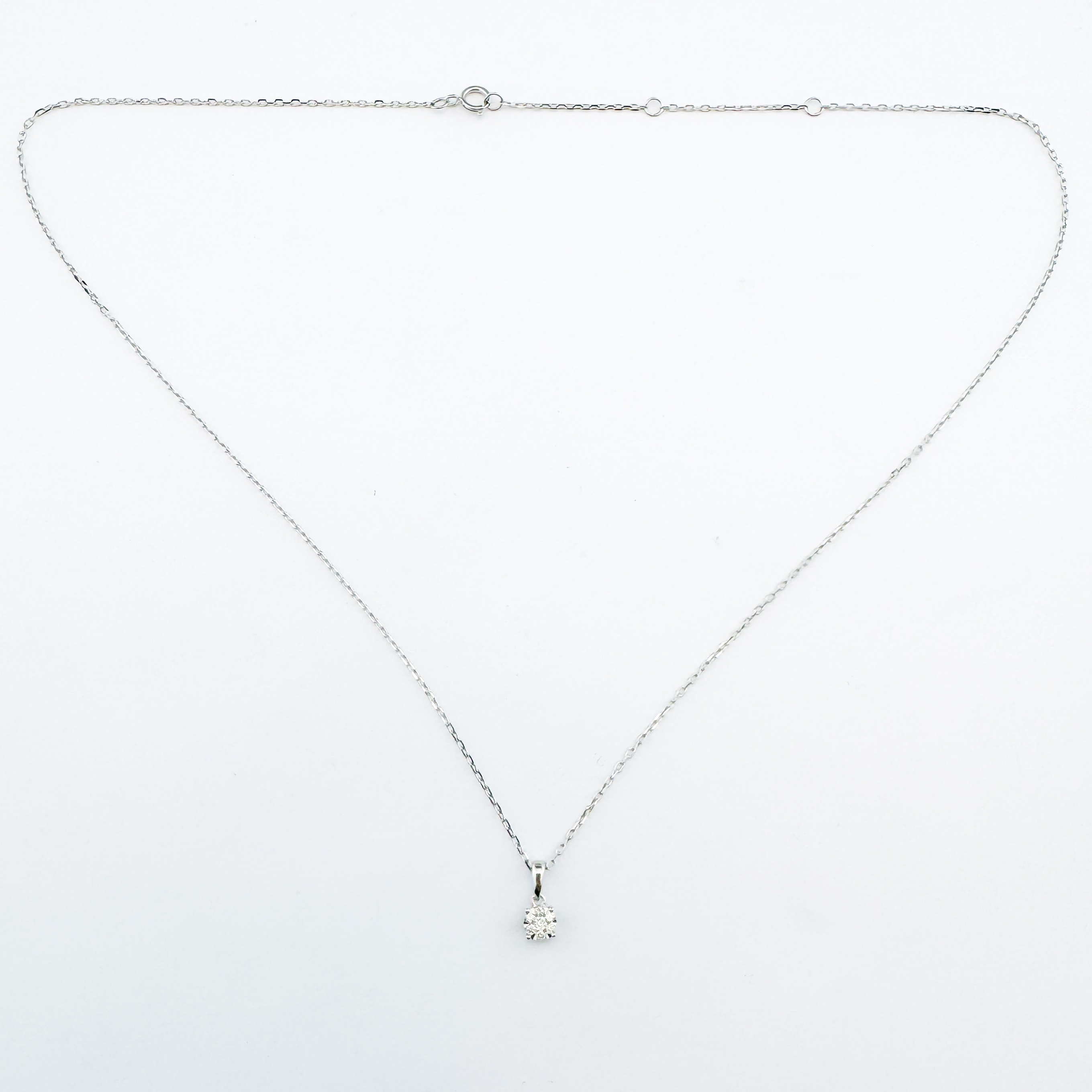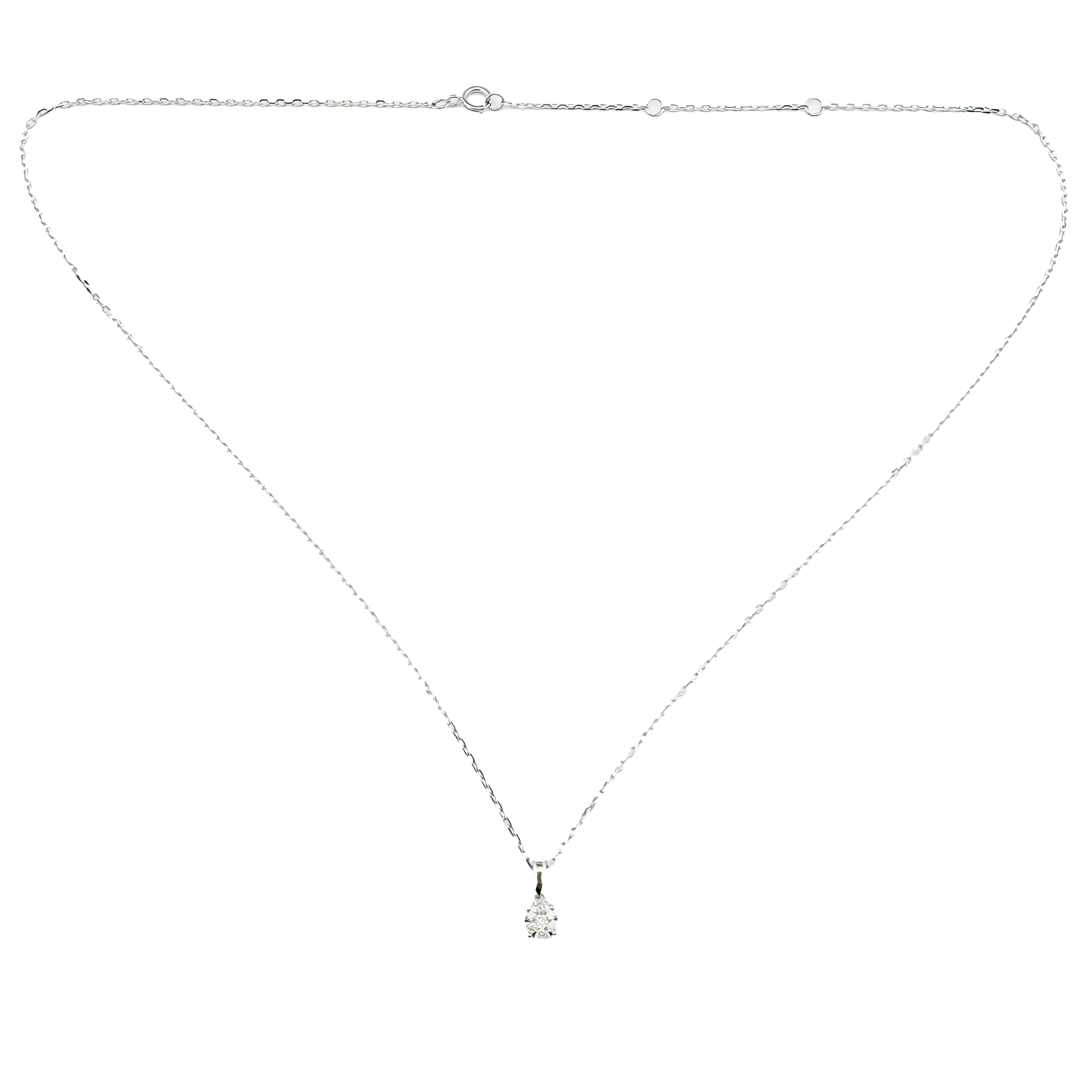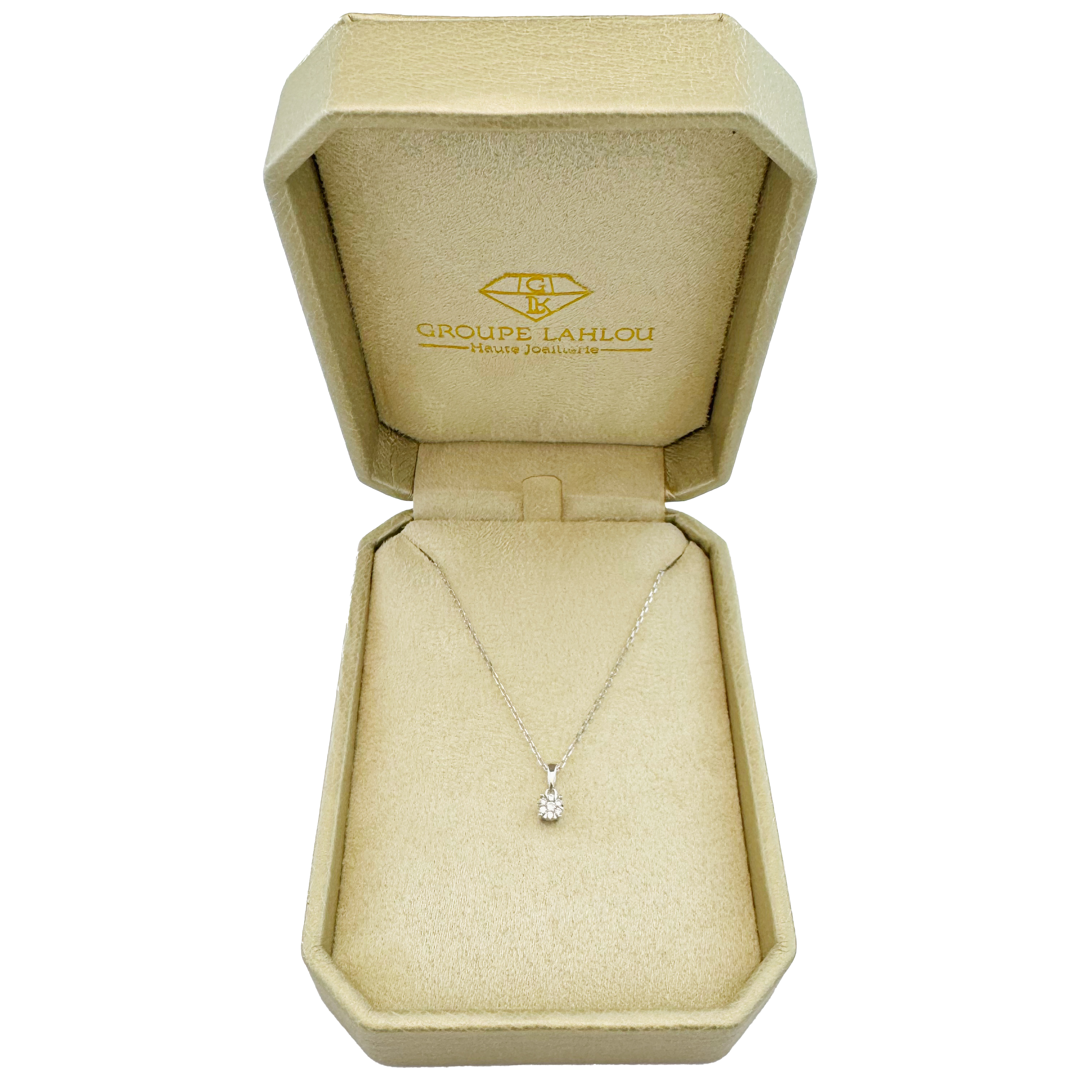 Sublimez votre élégance avec notre collier en Or blanc 18 carats exquis pendentif en diamant, une pièce intemporelle alliant sophistication et charme. Confectionné dans les meilleurs matériaux, ce magnifique pendentif est orné d'un diamant taille brillant qui scintille à chaque mouvement, délicatement suspendu à une chaîne élégante et résistante.