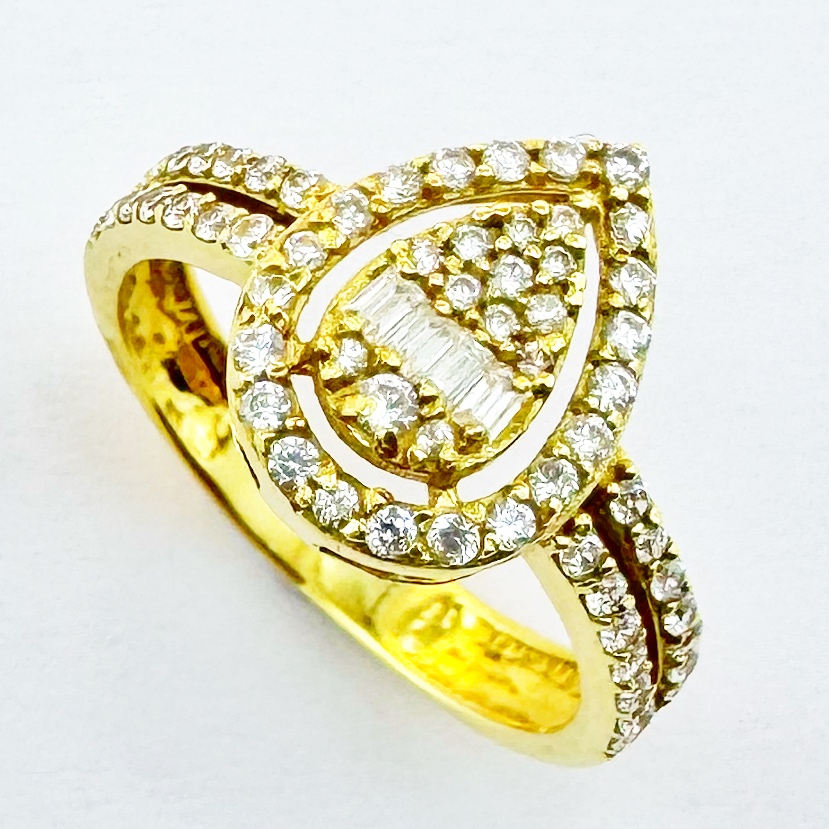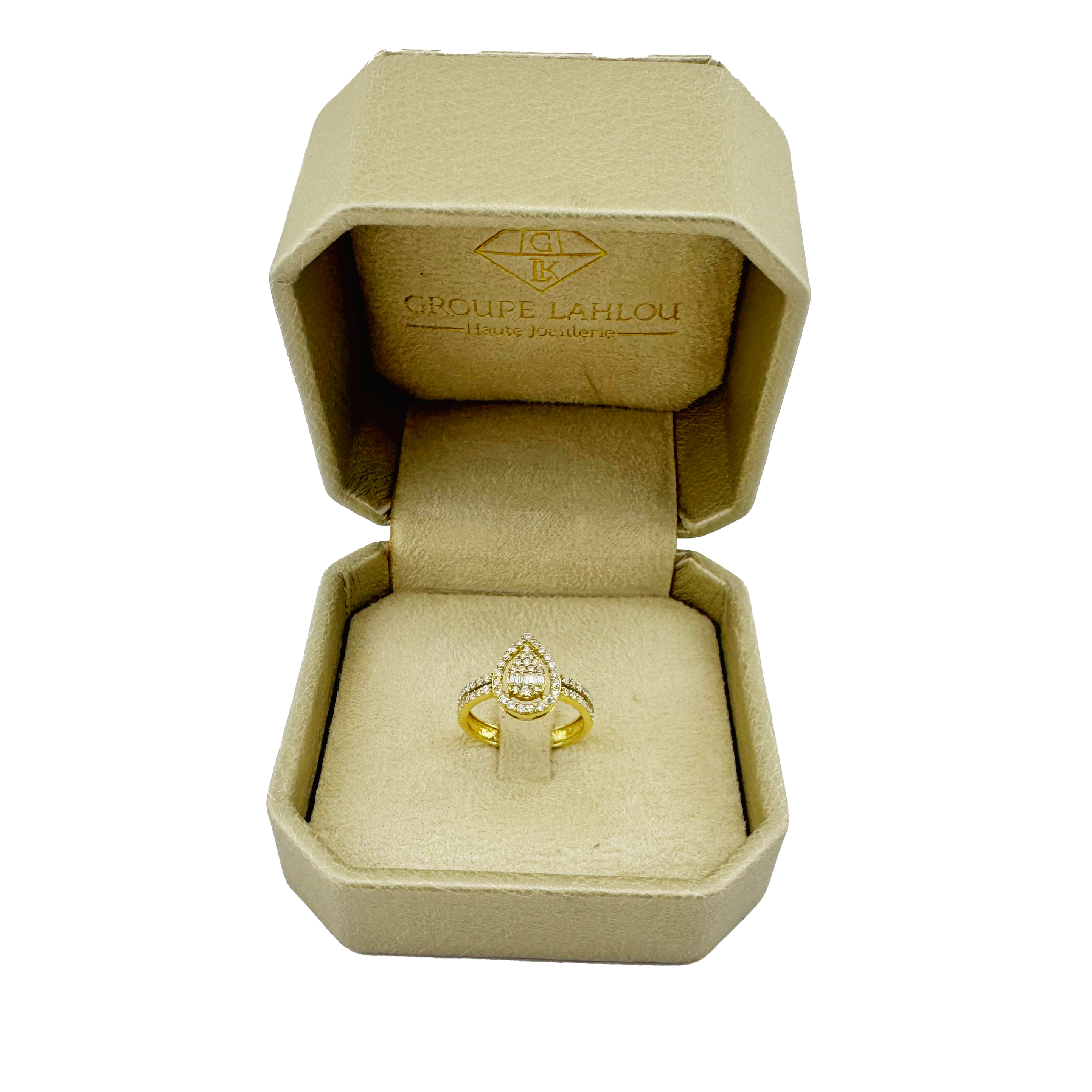 Bague de mariage en or jaune 18K arbore un design en forme de poire, sublimé par un double halo de diamants pavés. Son centre est composé d'un serti de diamants baguette entouré de pierres rondes scintillantes.