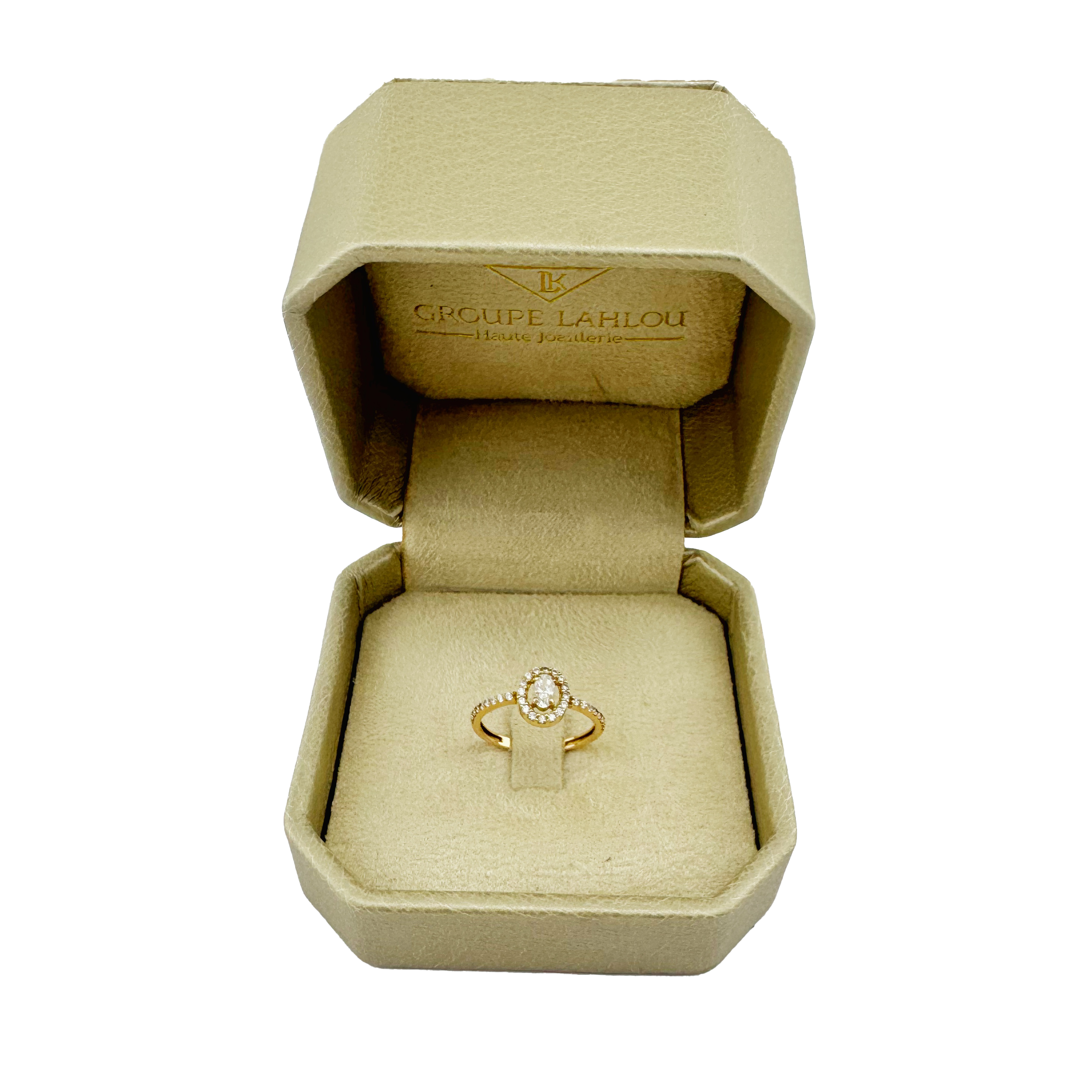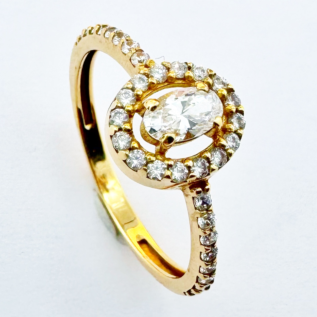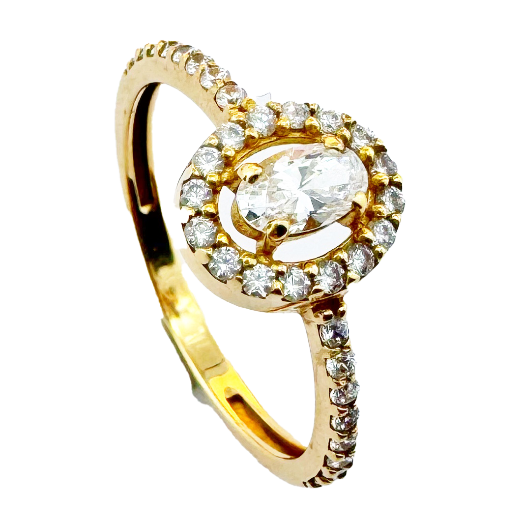 Cette bague e mariage en or rose 18K est ornée d'un diamant central ovale maintenu par un serti griffes. Elle est sublimée par un halo de petits diamants entourant la pierre principale, ajoutant éclat et raffinement.