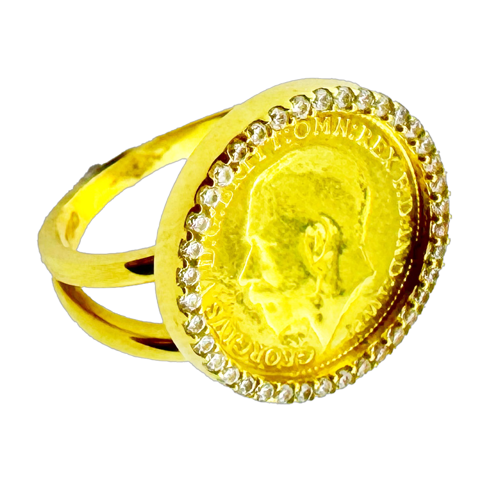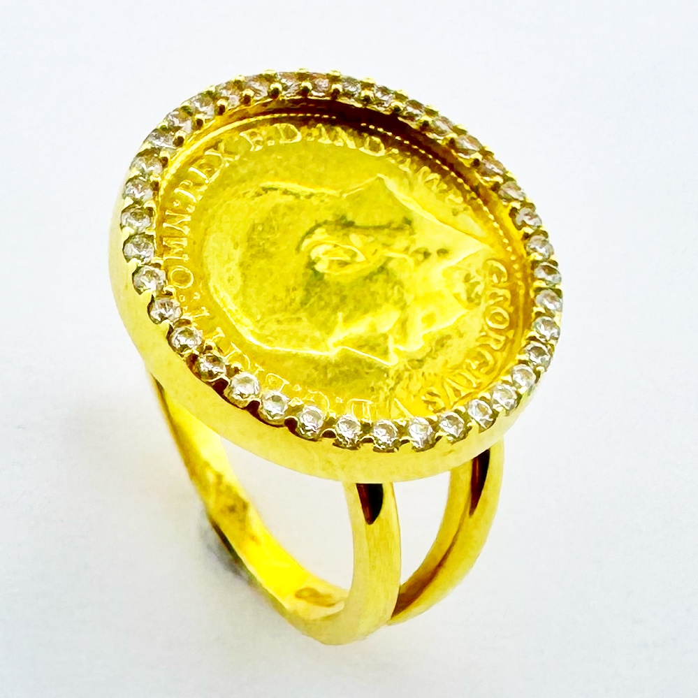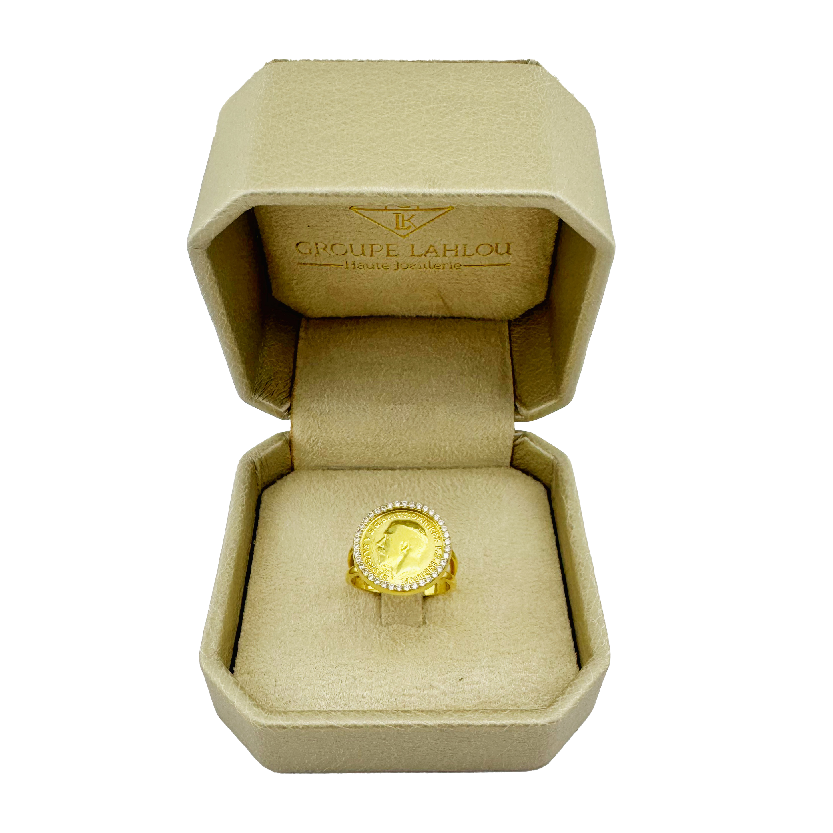 Cette bague moderne en Or jaune 18 carats se distingue par son élégante pièce centrale en forme de pièce de monnaie, ornée du portrait d'un visage classique.