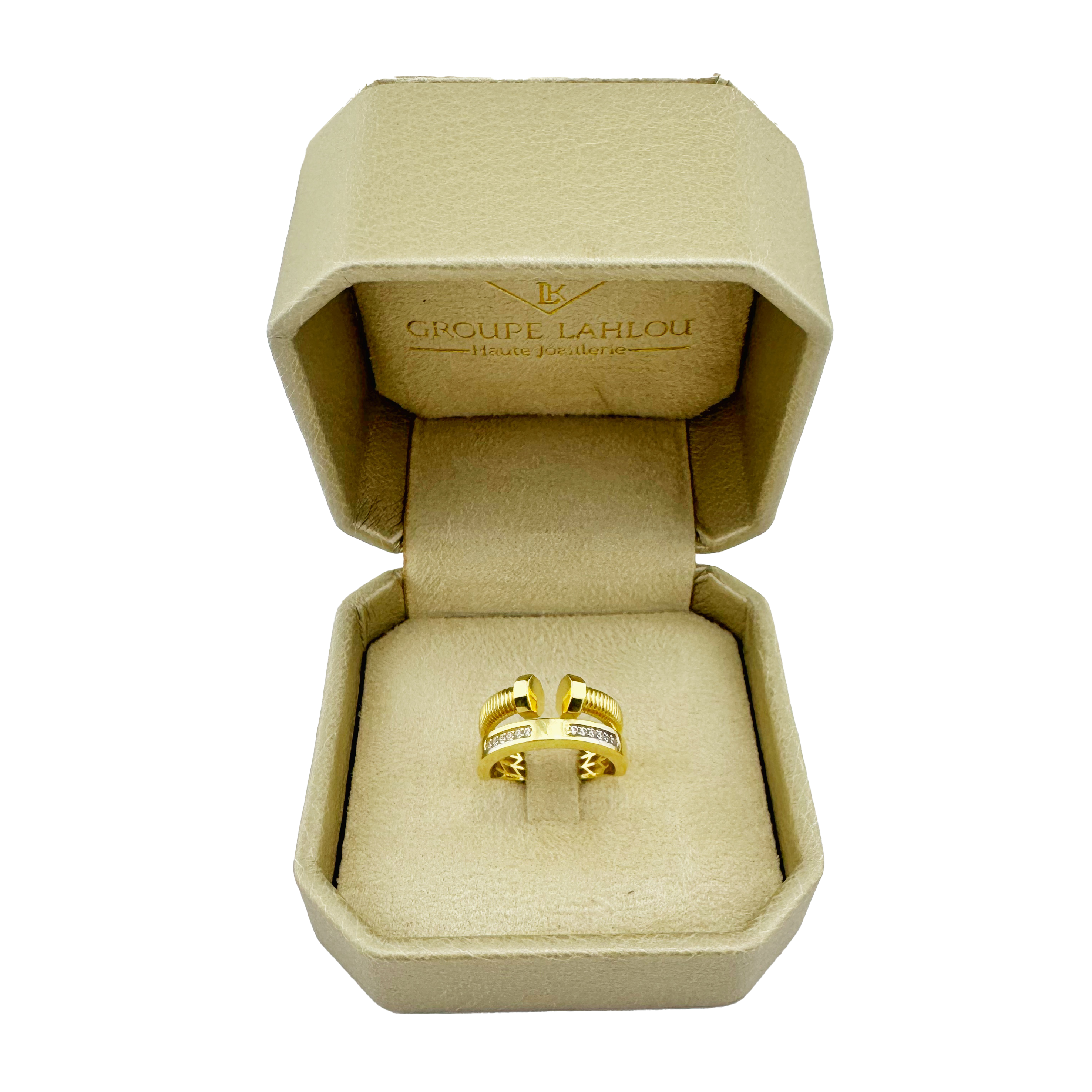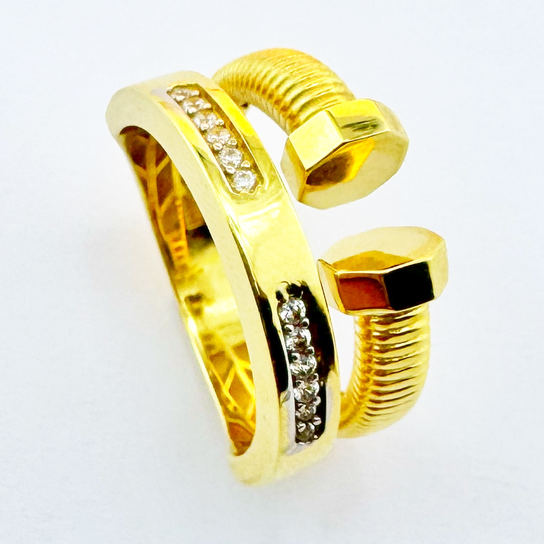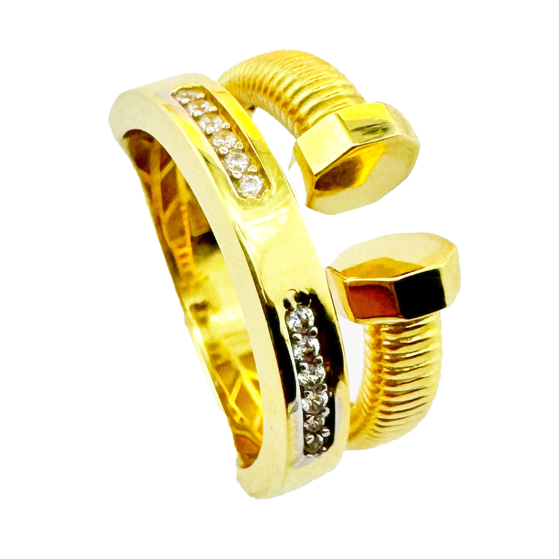 Cette bague moderne en Or jaune 18 carats présente un design audacieux et innovant inspiré par des éléments industriels. Elle se compose d'une bande lisse et brillante, surmontée de détails en forme de vis et d'écrou, ajoutant une touche unique et moderne.