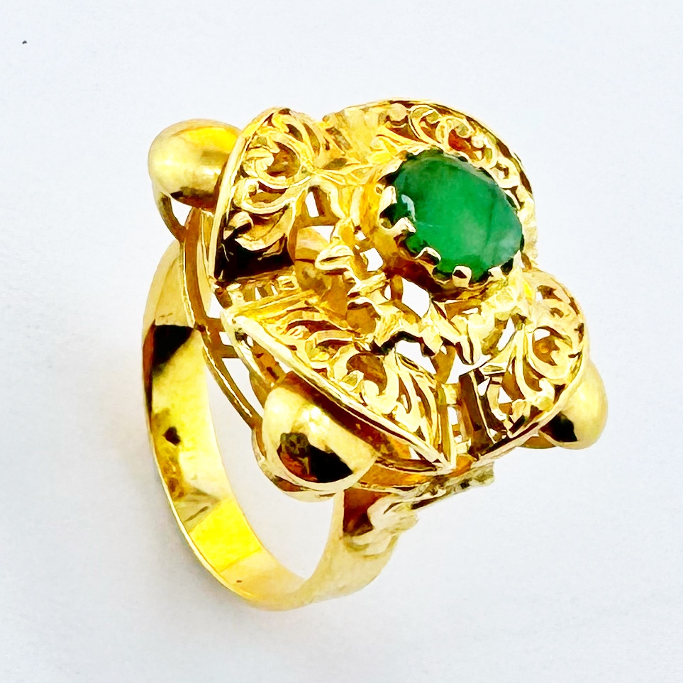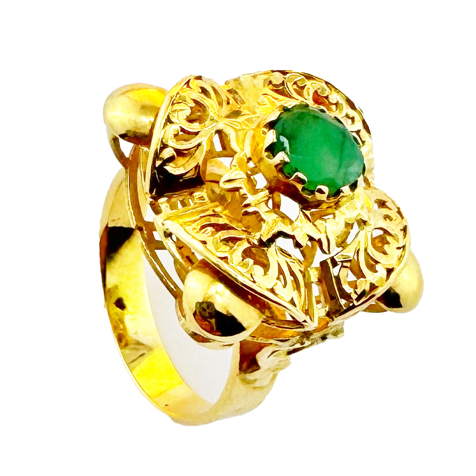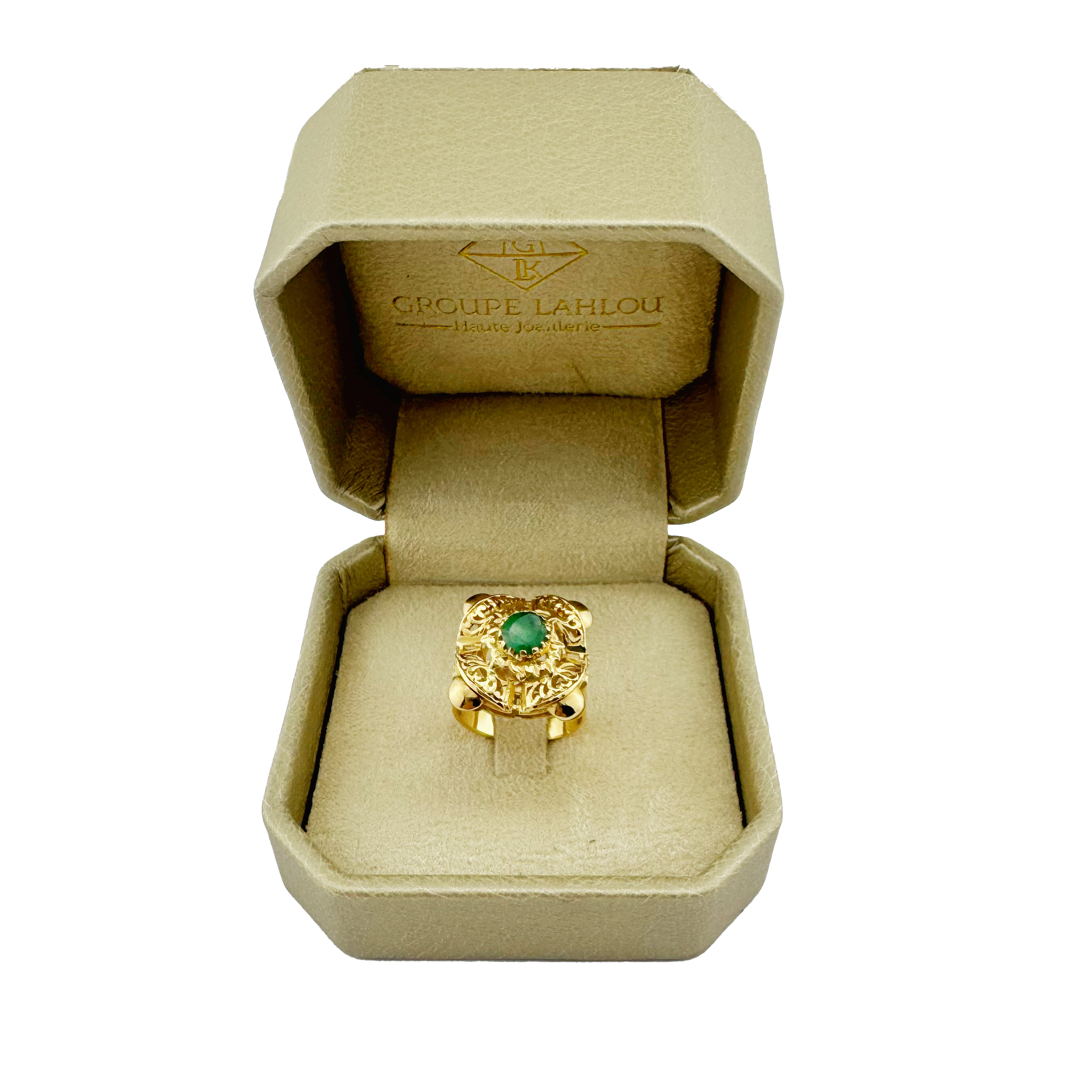 Bague traditionnelle en or jaune 18 carats, un bijou d’exception au charme intemporel. En son centre trône une émeraude naturelle éclatante, symbole de renouveau et de prospérité.