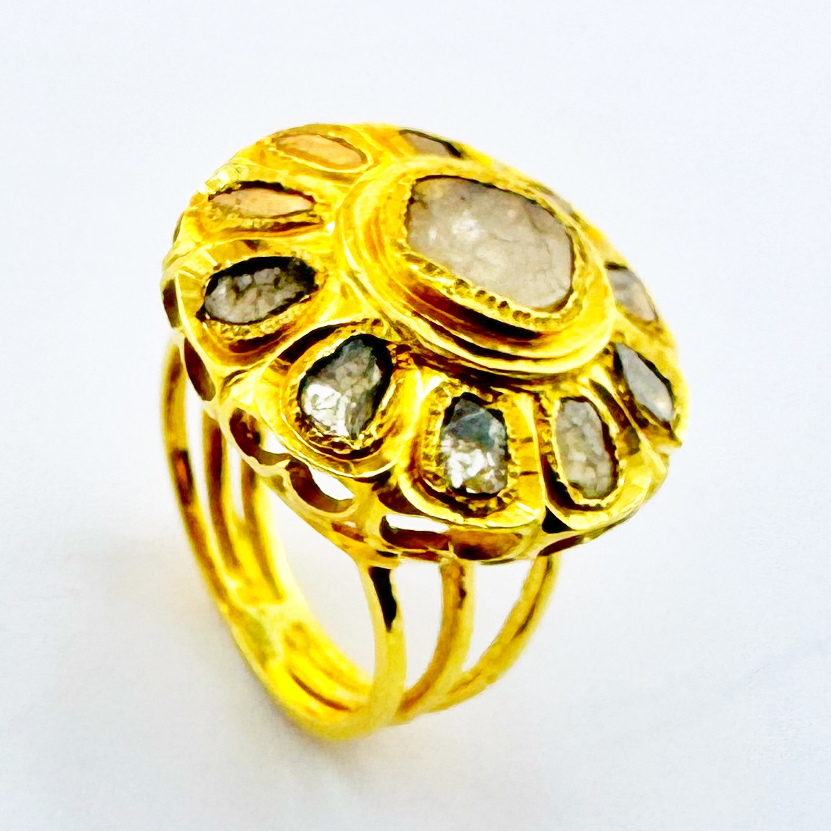Bague traditionnelle en or jaune 18 carats, inspirée de l’artisanat géorgien ibérique. Véritable pièce d’exception, elle est sertie de dix diamants taille rose, dont un diamant central plus imposant, sublimant la composition avec éclat et caractère.