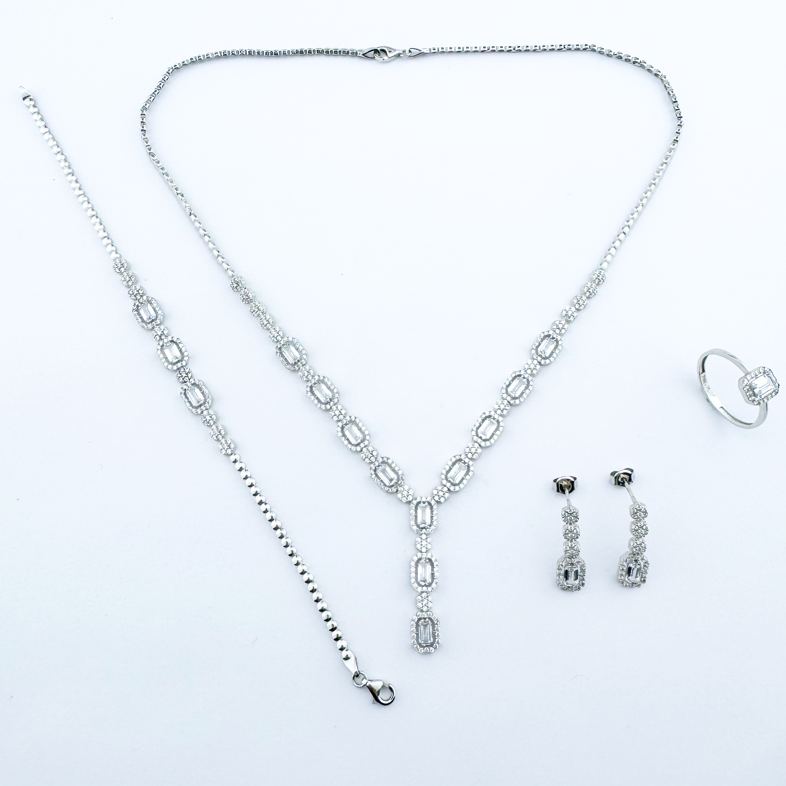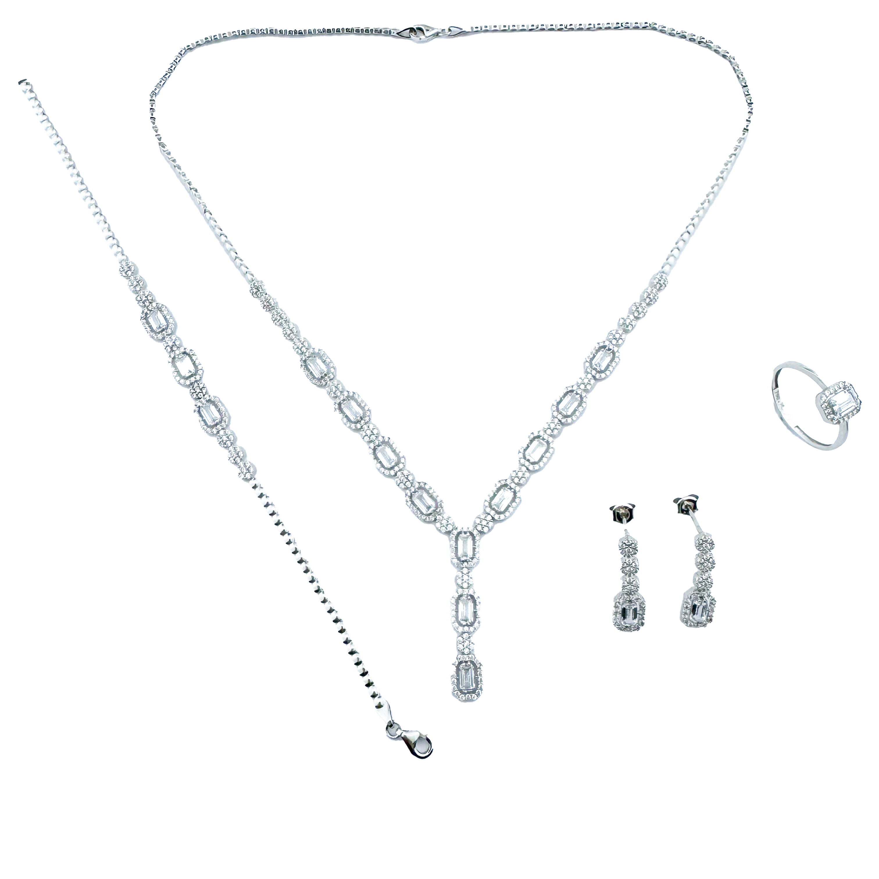 Cette parure complète se compose d’un collier en "V" géométrique, d’un bracelet à motifs répétés, de boucles d’oreilles pendantes et d’une bague centrale audacieuse. Les diamants, taillés en baguette et en brillant, sont minutieusement sertis pour créer un jeu de lumière structuré, captant chaque reflet avec intensité.