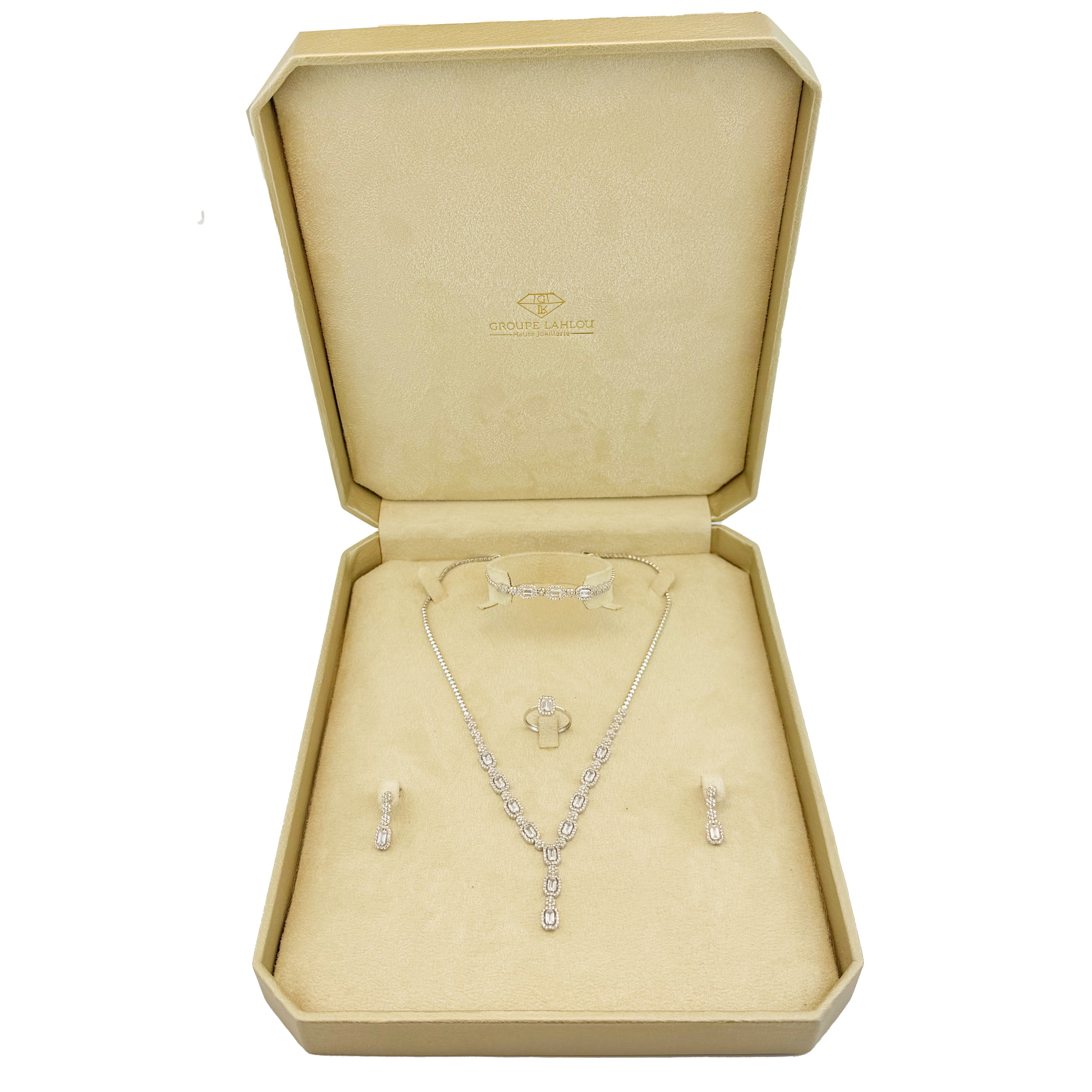 Parure et ensemble de haute joaillerie en or blanc 18 carats 750/1000, magnifiée par un pavage de diamants naturels de qualité supérieure. Son design unique, aux motifs rectangulaires finement ciselés, évoque les colonnades d’un palais ou les vitraux lumineux d’un édifice royal. Pensée pour les grandes occasions – mariage, fiançailles, caftan de cérémonie ou soirée de gala – cette parure sublime la silhouette avec majesté et finesse.