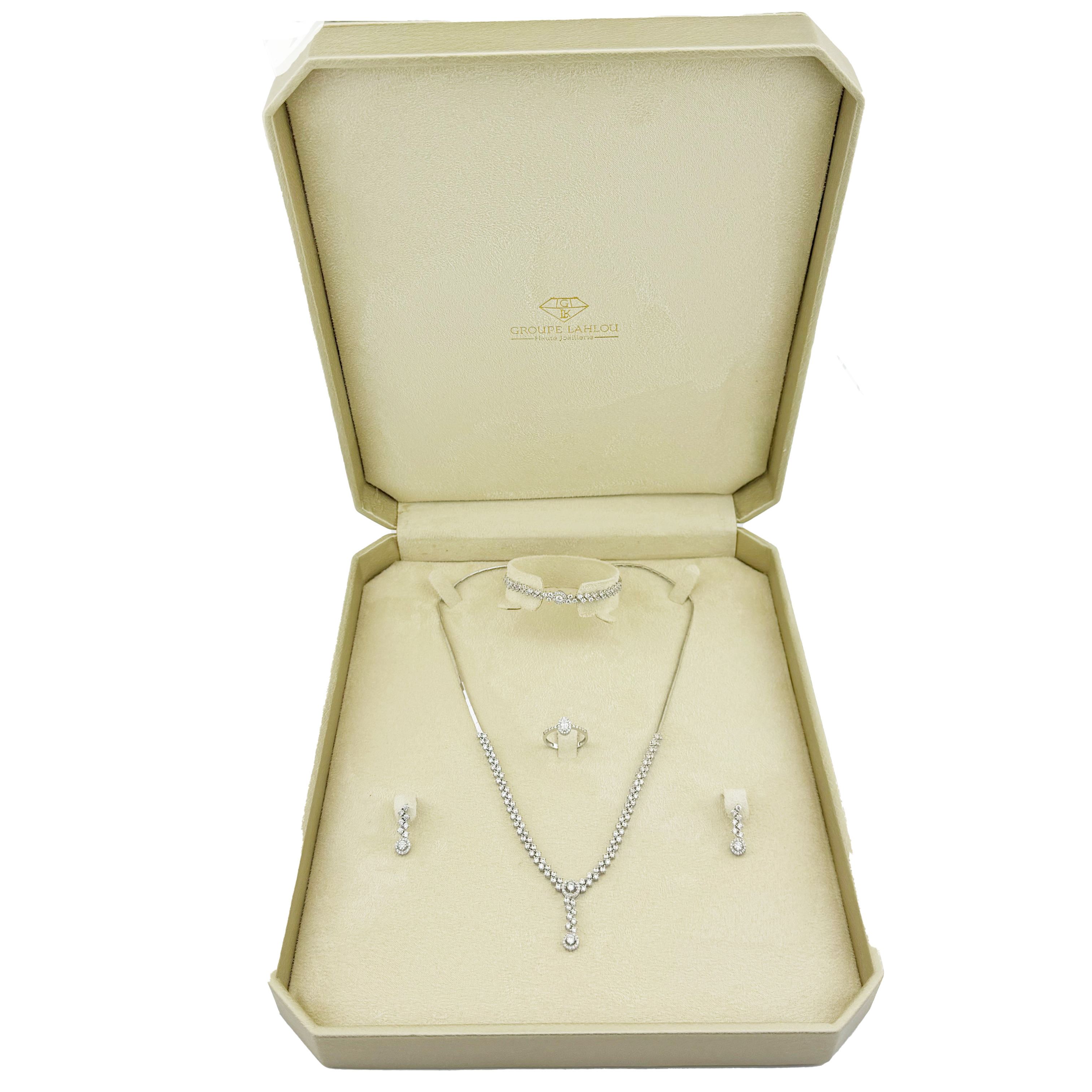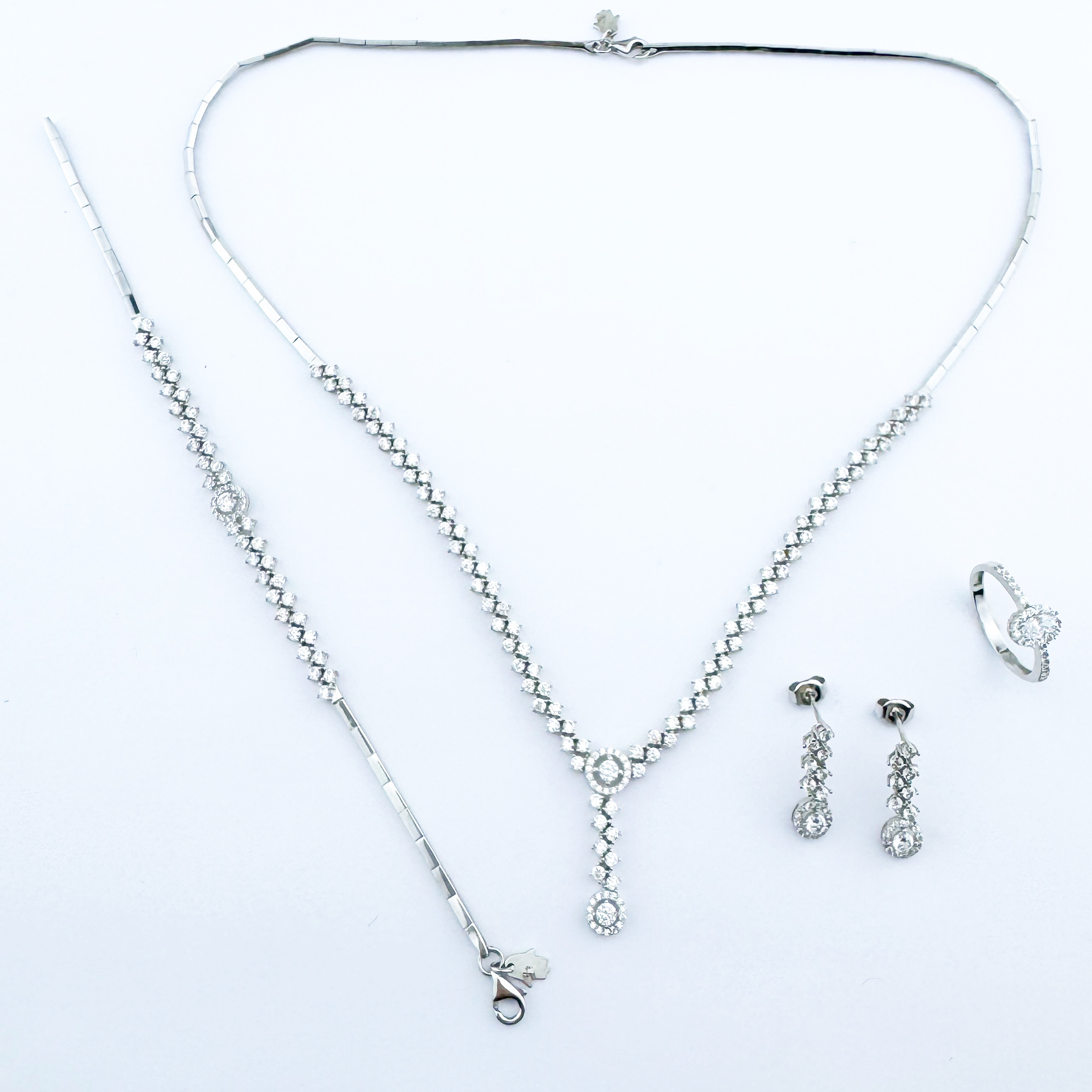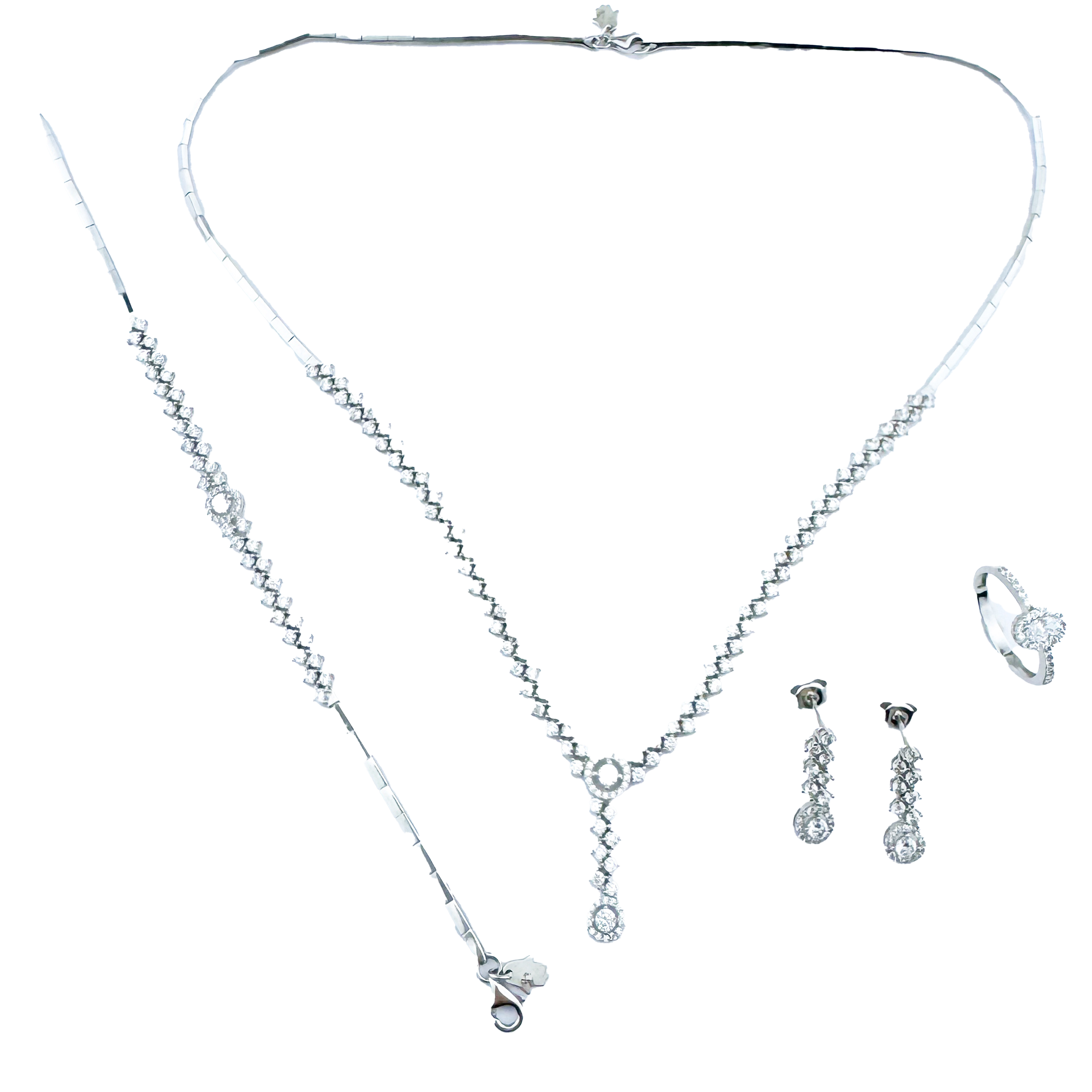 Le collier en "Y" présente une chute centrale brillante, mettant en valeur le décolleté avec subtilité. Le bracelet assorti prolonge cette élégance sur le poignet, tandis que les boucles d’oreilles pendantes apportent une touche de mouvement et d’éclat. La bague, ornée d’un diamant central entouré d’un halo scintillant, complète l’ensemble avec une harmonie parfaite.
