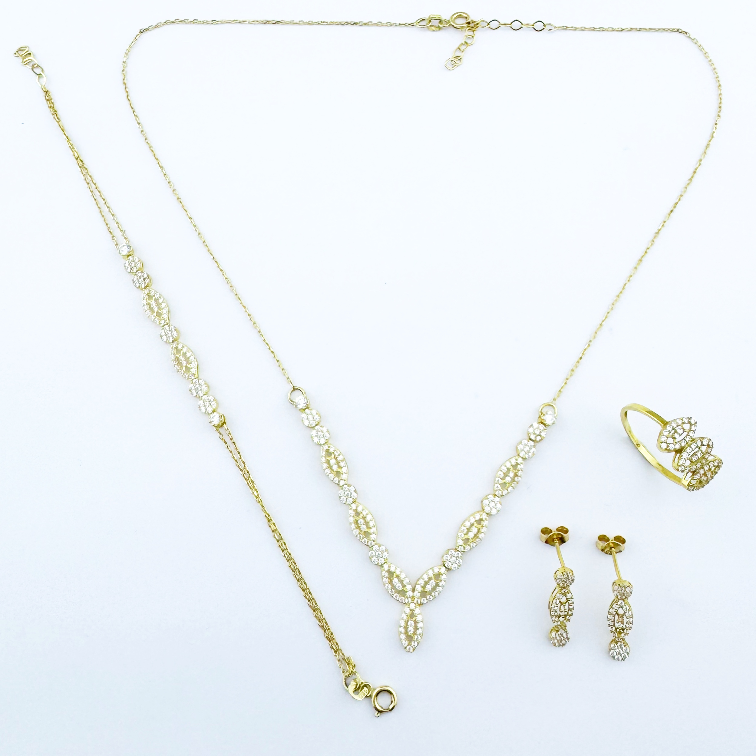 Le collier en "V", rehaussé par un motif feuillu central, met délicatement en valeur le cou. Le bracelet répète ce jeu de feuillage avec finesse, tandis que les boucles d’oreilles pendantes assurent équilibre et élégance. La bague, audacieuse et stylisée, attire l’œil avec ses trois motifs ovales superposés.
