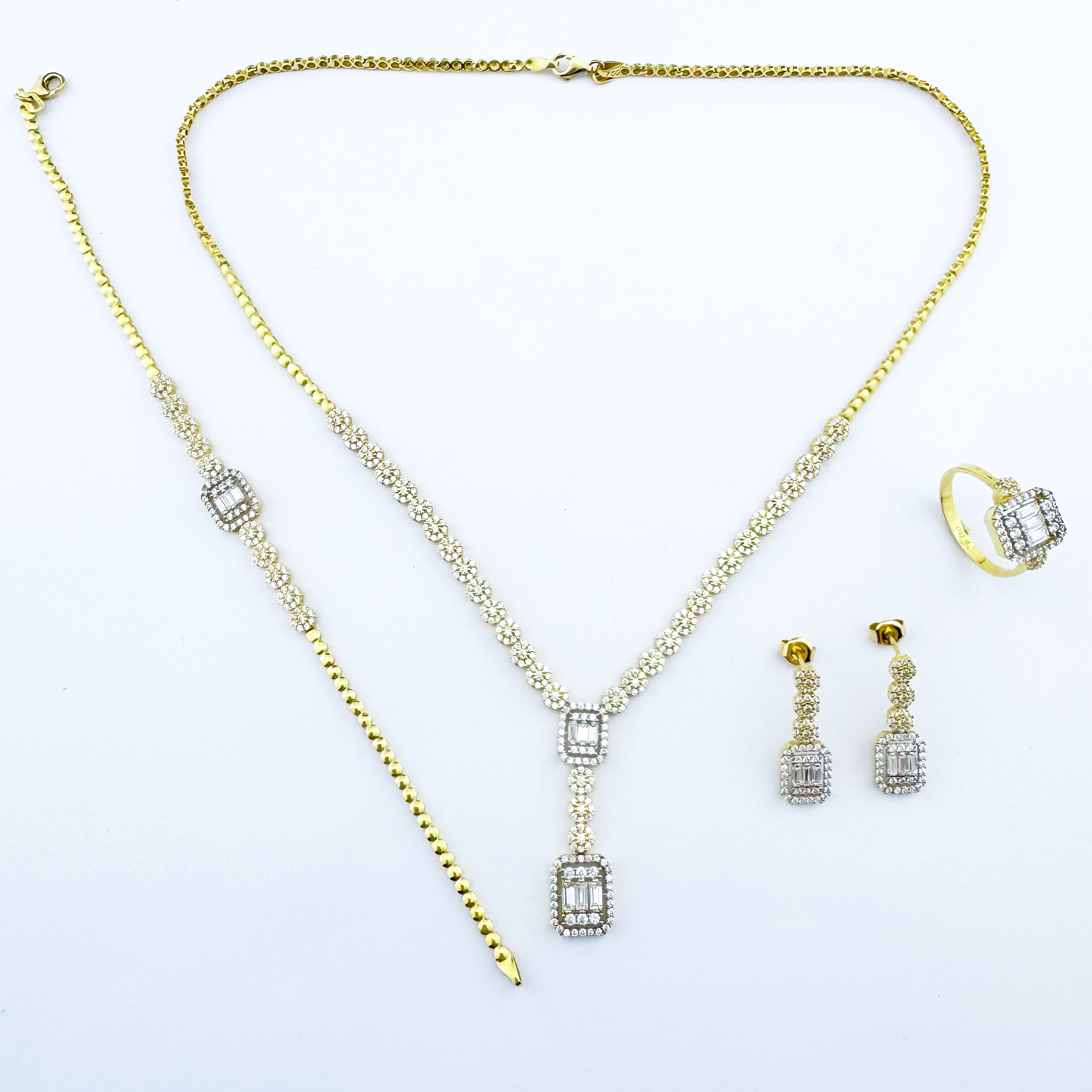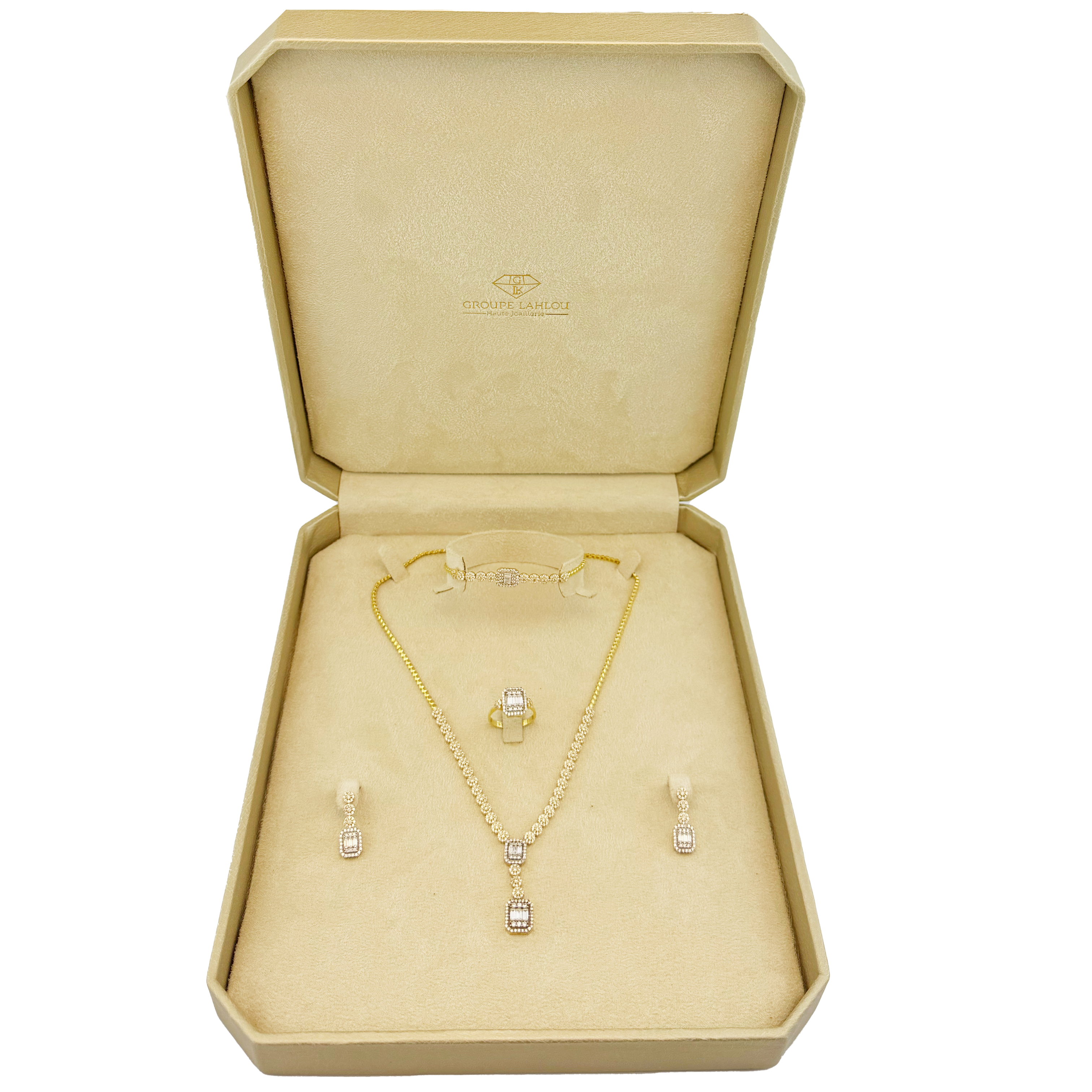avec la parure en Or jaune 18 carats et diamants naturels Éclat Royal, une œuvre d’art joaillière à l’élégance contemporaine. Composée d’un collier en Y, d’un bracelet raffiné, de boucles d’oreilles pendantes, et d’une bague à motif rectangulaire, cette parure incarne le raffinement absolu. Une pièce idéale pour les femmes modernes, affirmées et élégantes. Un choix parfait pour les grandes occasions mariage, soirée de fiançailles ou réception luxueuse.