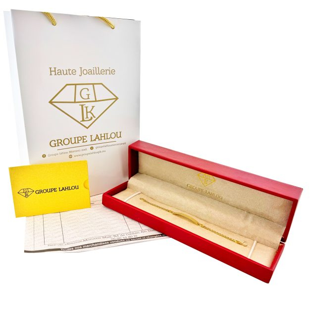 Le double cordon tressé en Or pure 750/1000, également doré, assure un excellent confort au poignet tout en offrant une touche d’originalité. Les finitions soignées et la brillance de l’or témoignent d’un savoir-faire joaillier raffiné de notre maison GROUPE LAHLOU GLK.
