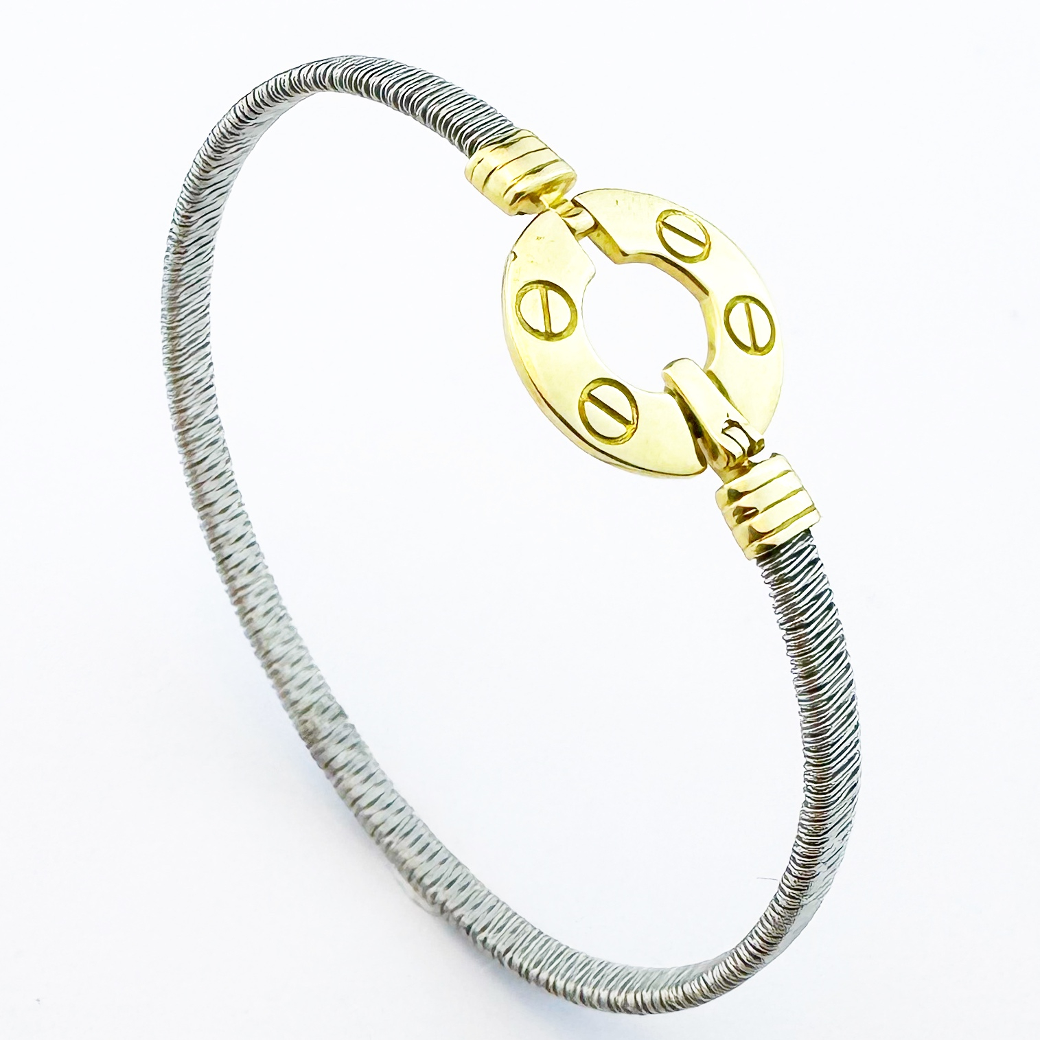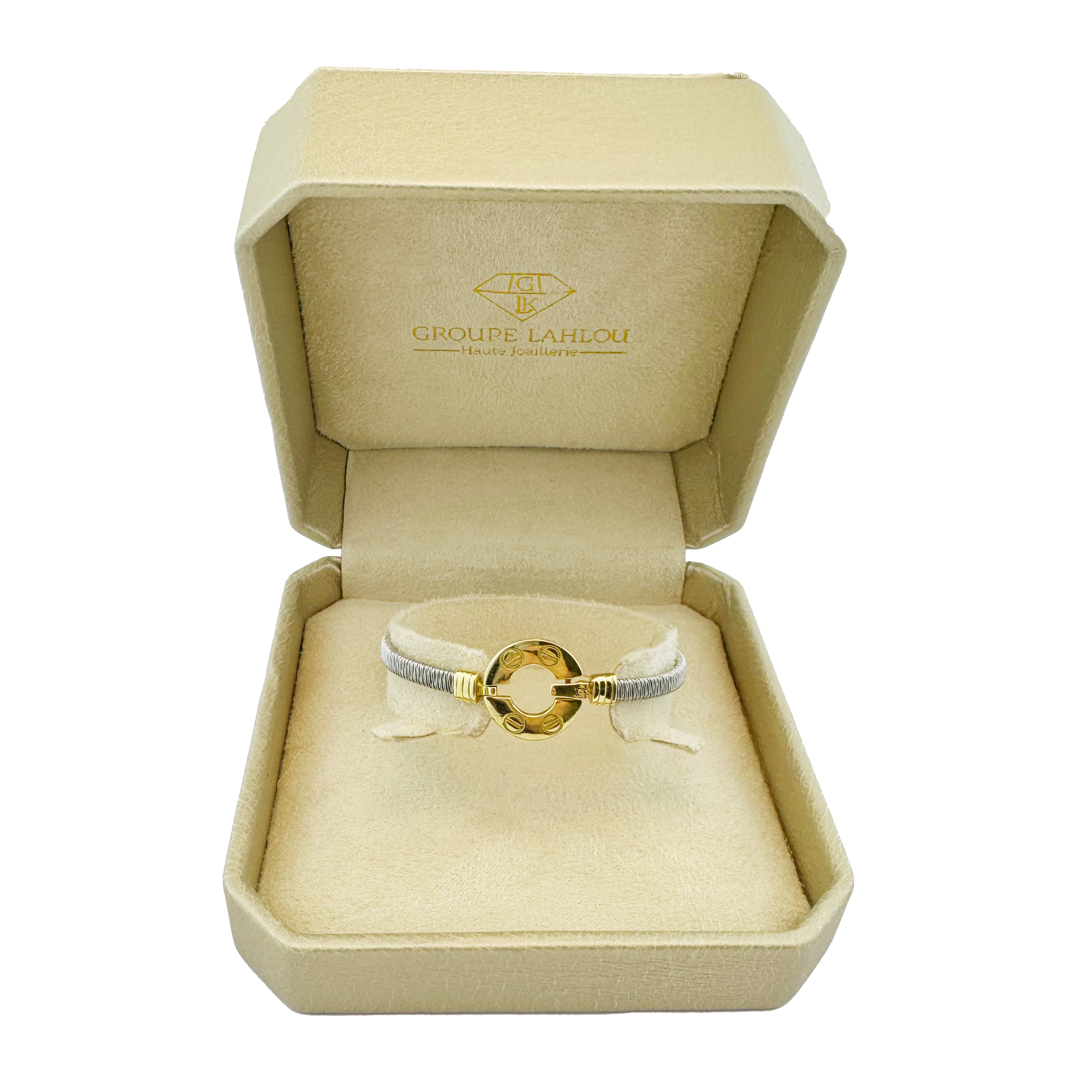 Ce bracelet masculin allie design industriel et élégance urbaine, avec un fermoir circulaire en Or jaune 18 carats orné de motifs de vis apparentes, emblématiques d’un style mécanique affirmé. La teinte dorée apporte une touche de luxe discret, contrastant subtilement avec le câble acier pour un rendu audacieux et raffiné.